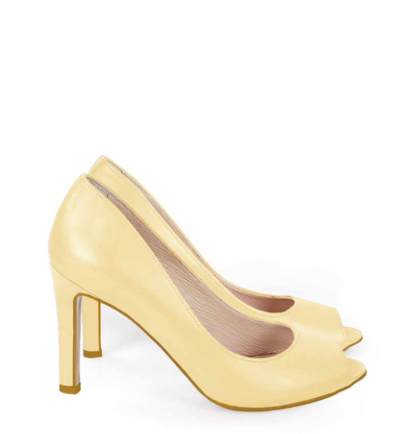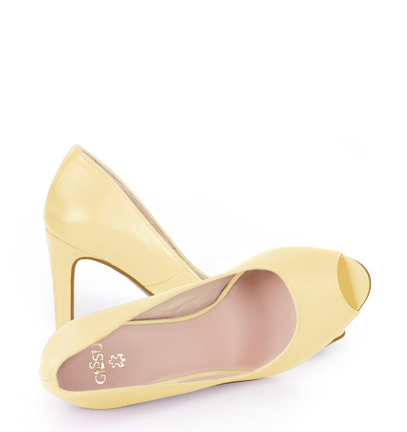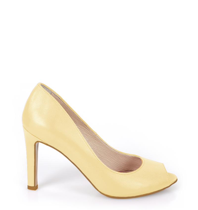 AGATE – Żółte pastelowe szpilki z odkrytym palcem, na 9,5 cm obcasie (wysokość obcasa jest mierzona w rozmiarze 37). Otwarte szpilki open-toe na wysokiej grubości stabilnej szpilce. Buty wykonane z naturalnej skóry licowej układającej się do stopy. Tęgość butów to F 1/2. Żółte czółenka na wysokim obcasie mogą stanowić uzupełnienie codziennych kreacji oraz stanowić kolorowy dodatek do sukni ślubnych.