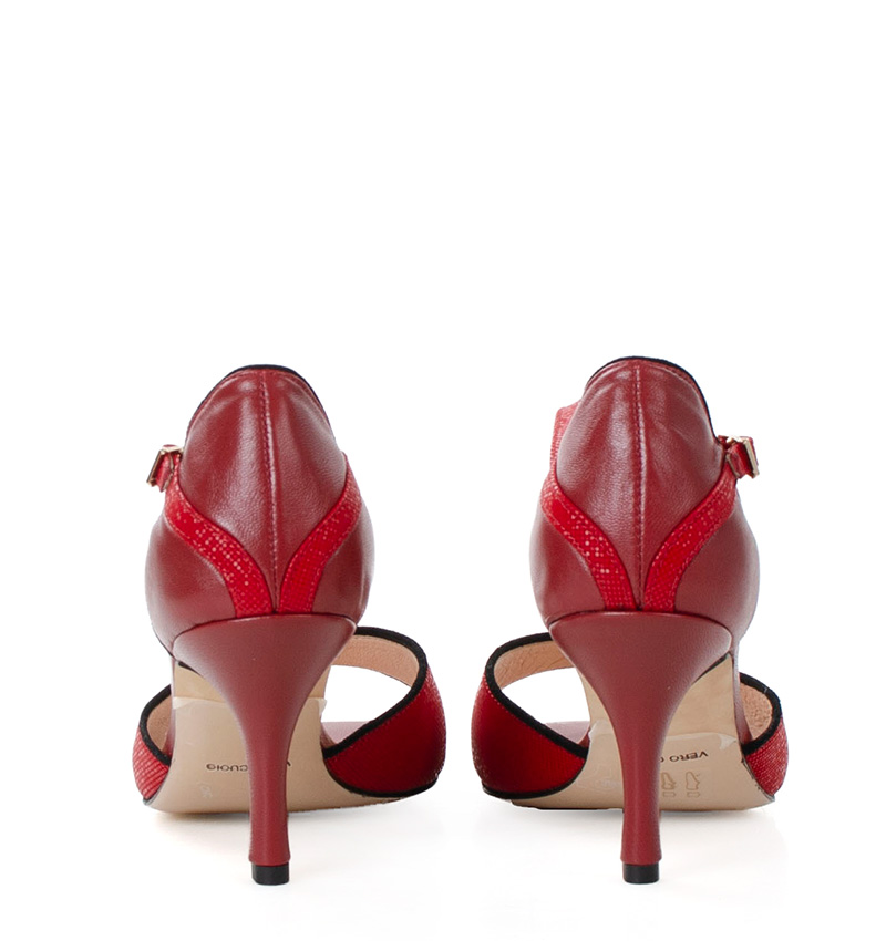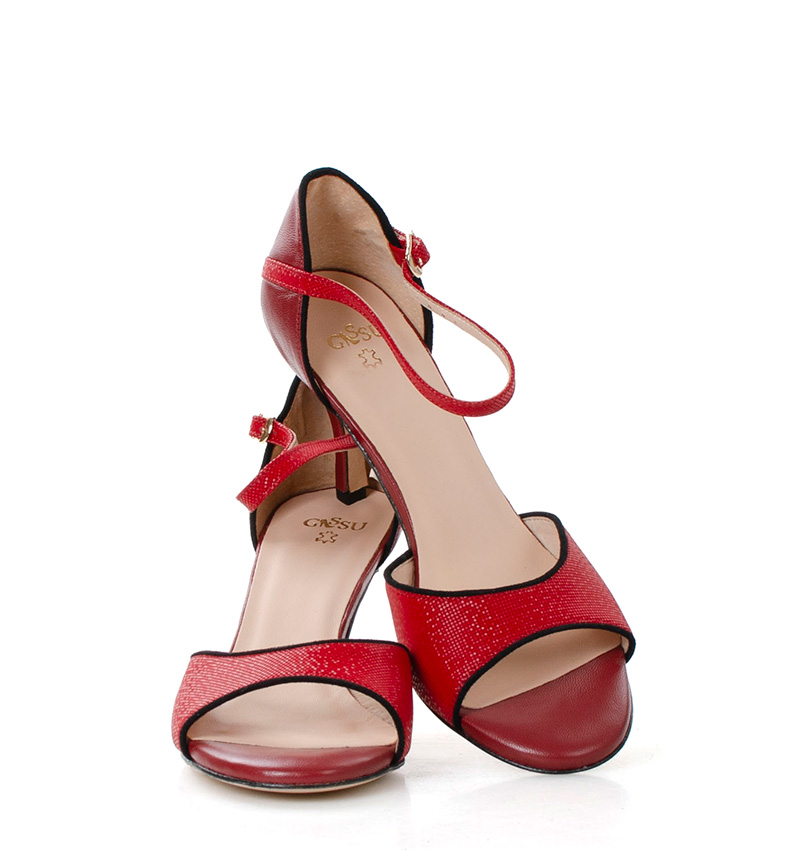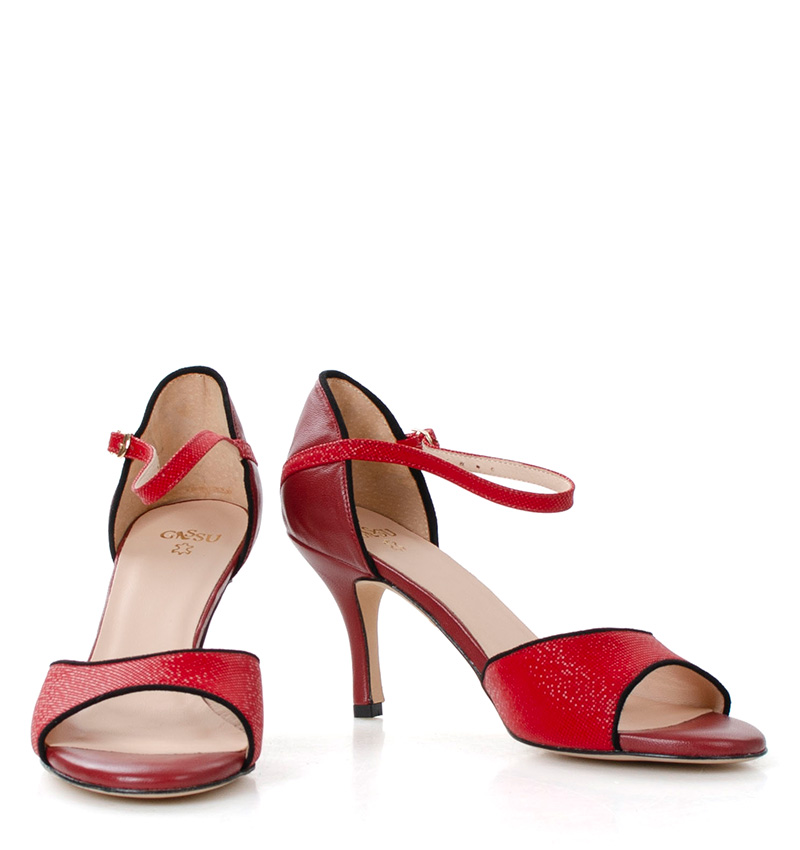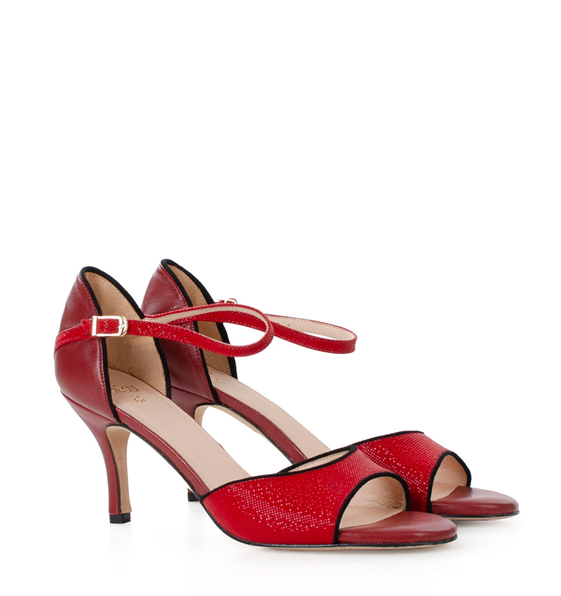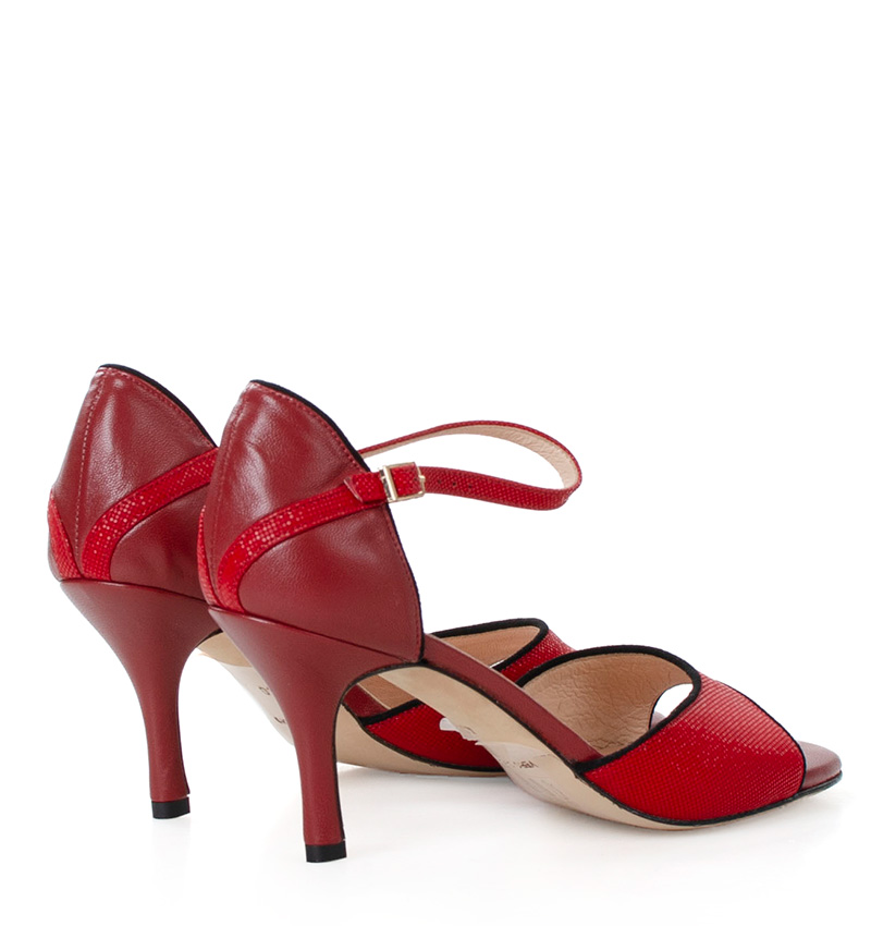 ALEJANDRA – Sandałki do tańca w kolorystyce black-red. Model o wyrazistym charakterze, łączący różne faktury czerwieni z eleganckim, czarnym akcentem. Zabudowana pięta wykonana z gładkiej, czerwonej skóry licowej, przedni pasek z fakturowanego czerwonego tejusa. Czerwona opaska zapinana na sprzączkę otula kostkę, podkreślając kobiecą sylwetkę. Delikatna czarna lamówka nadaje całości wyrafinowanego wykończenia. Podeszwa ze skóry licowej zapewnia odpowiedni poślizg i komfort w tańcu. Idealne do tanga, latino i standardu. Obcas 7,5 cm (dla rozmiaru 37).