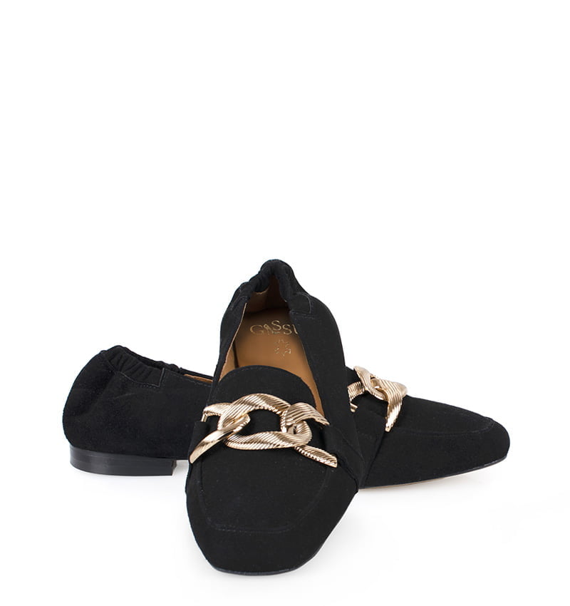 ALINA – czarne mokasyny ze złotą ozdobą