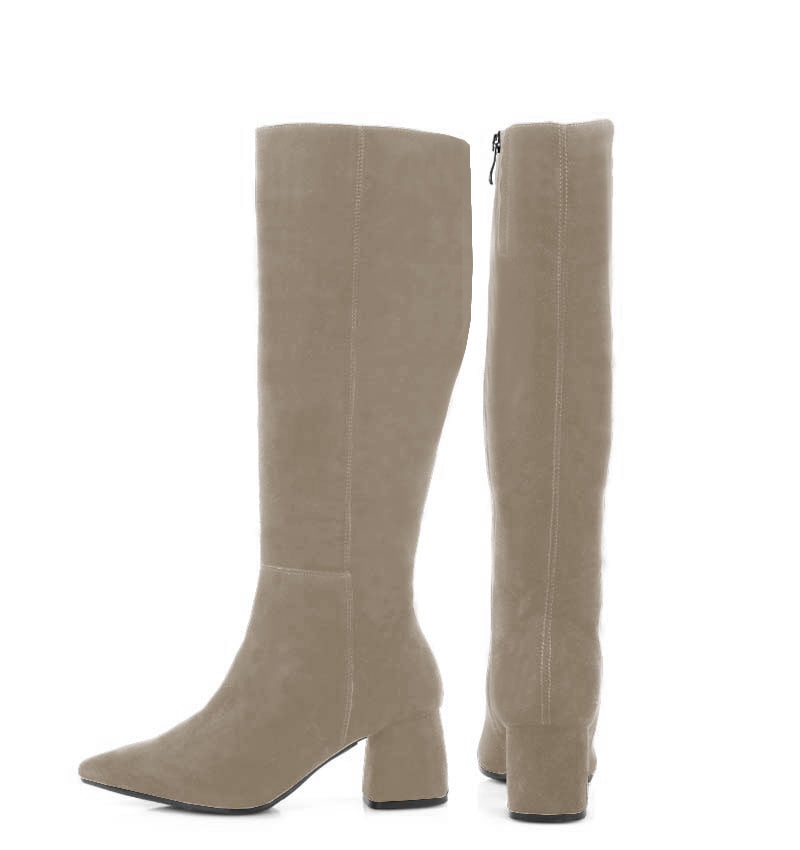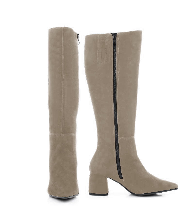 AURORA – Beżowe kozaki do kolana, na szerokim słupku. Średniej wysokości 6,5 cm obcas (wysokość obcasa jest mierzona w rozmiarze 37).