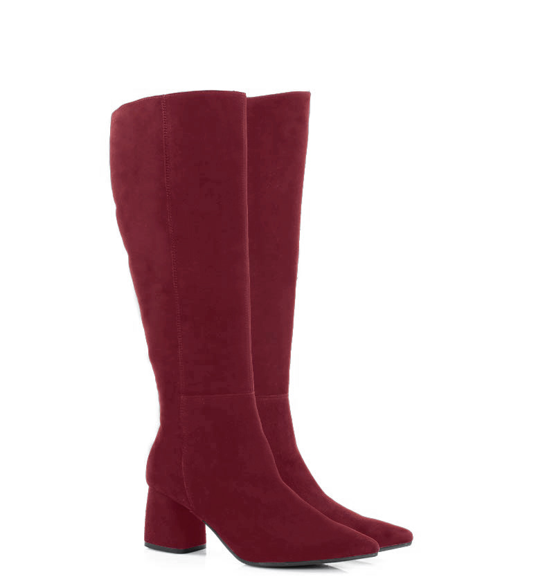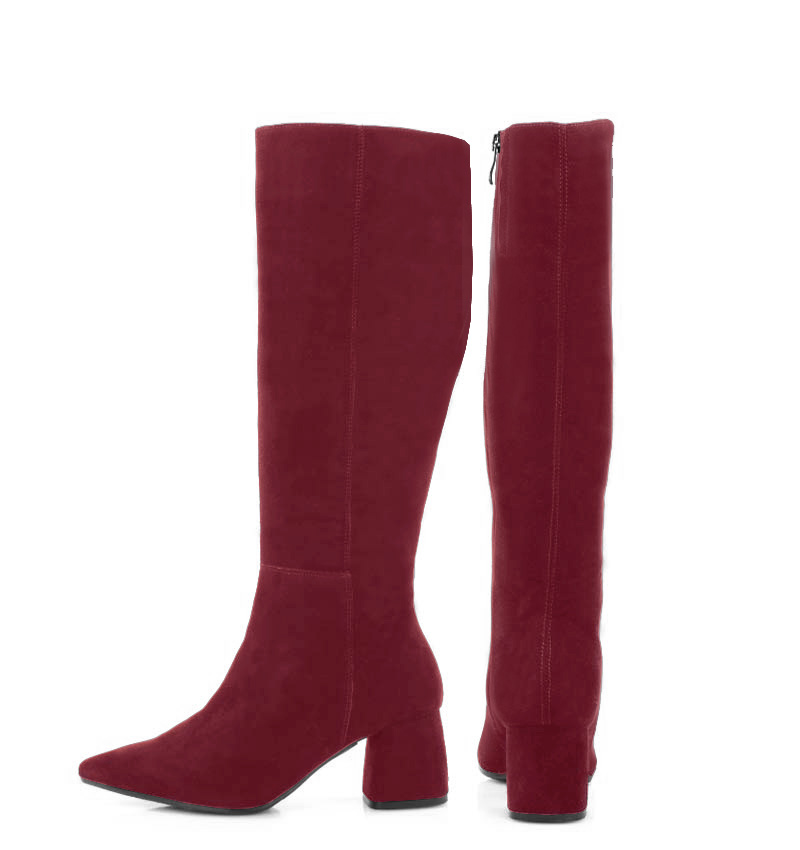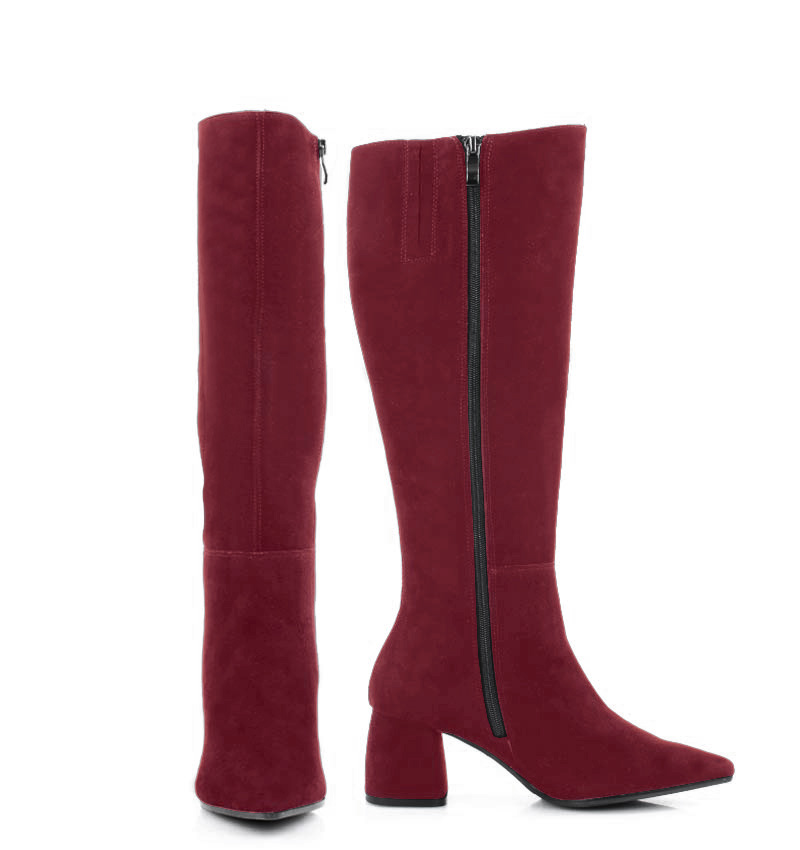 AURORA – Bordowe kozaki do kolana, na szerokim słupku. Średniej wysokości 6,5 cm obcas (wysokość obcasa jest mierzona w rozmiarze 37).