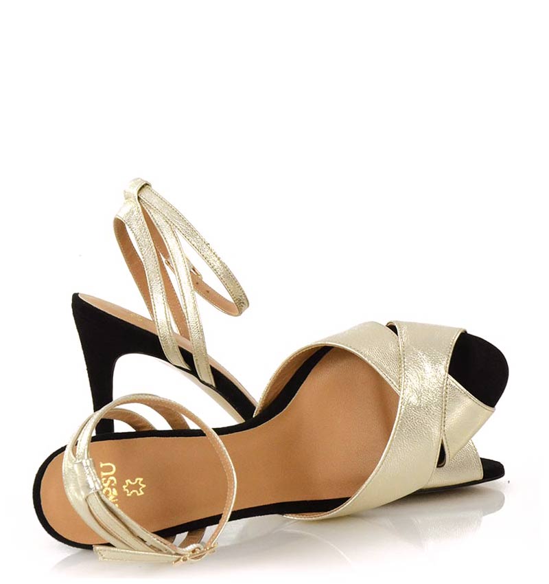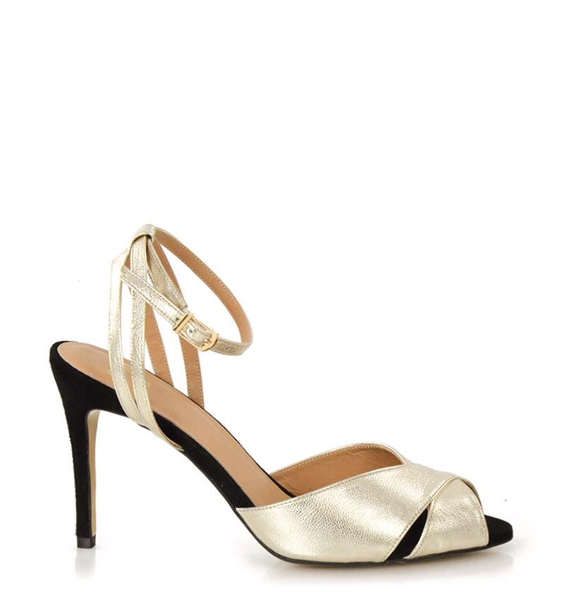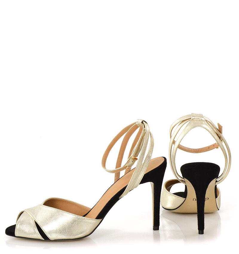 CAROLYN – Złote sandały na szpilce z czarnym obcasem
