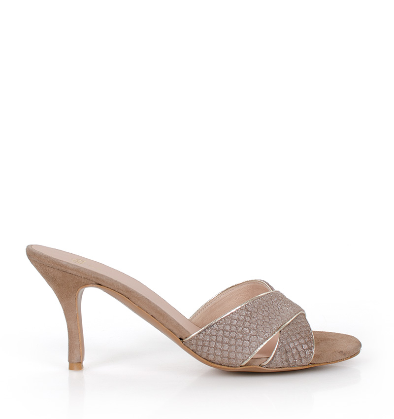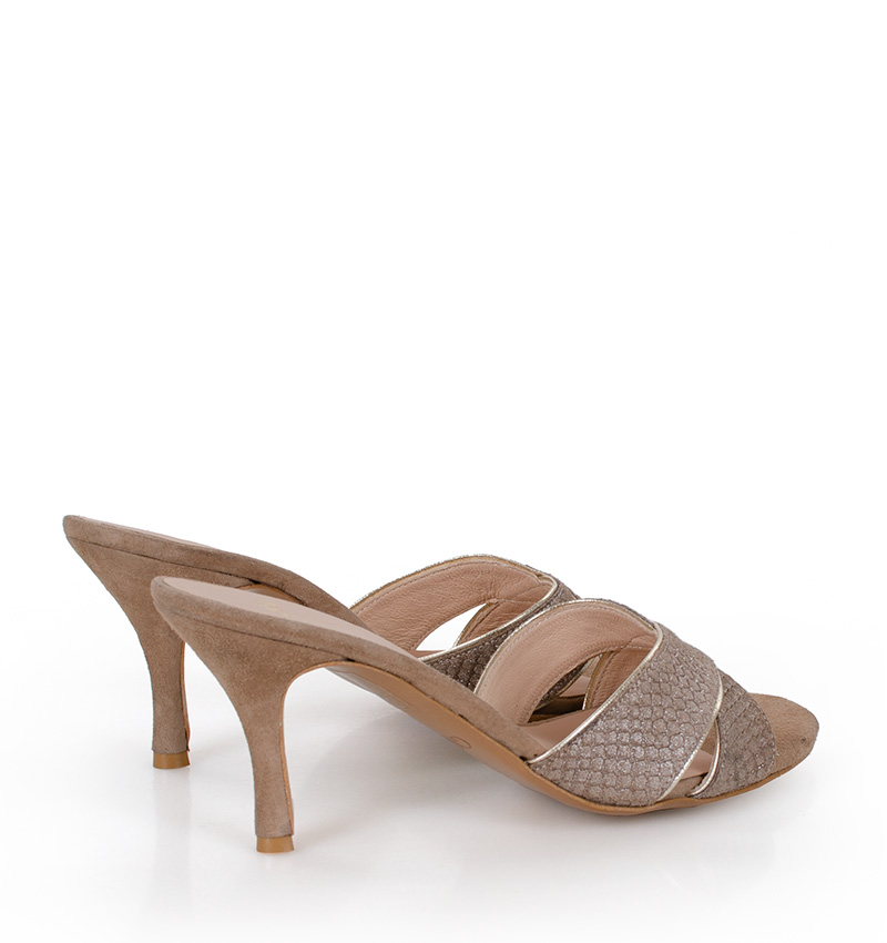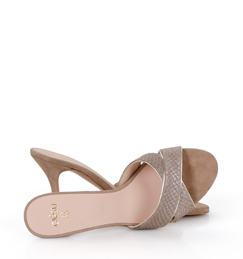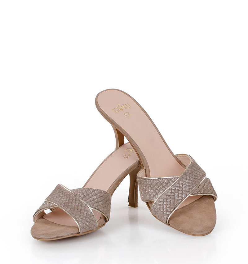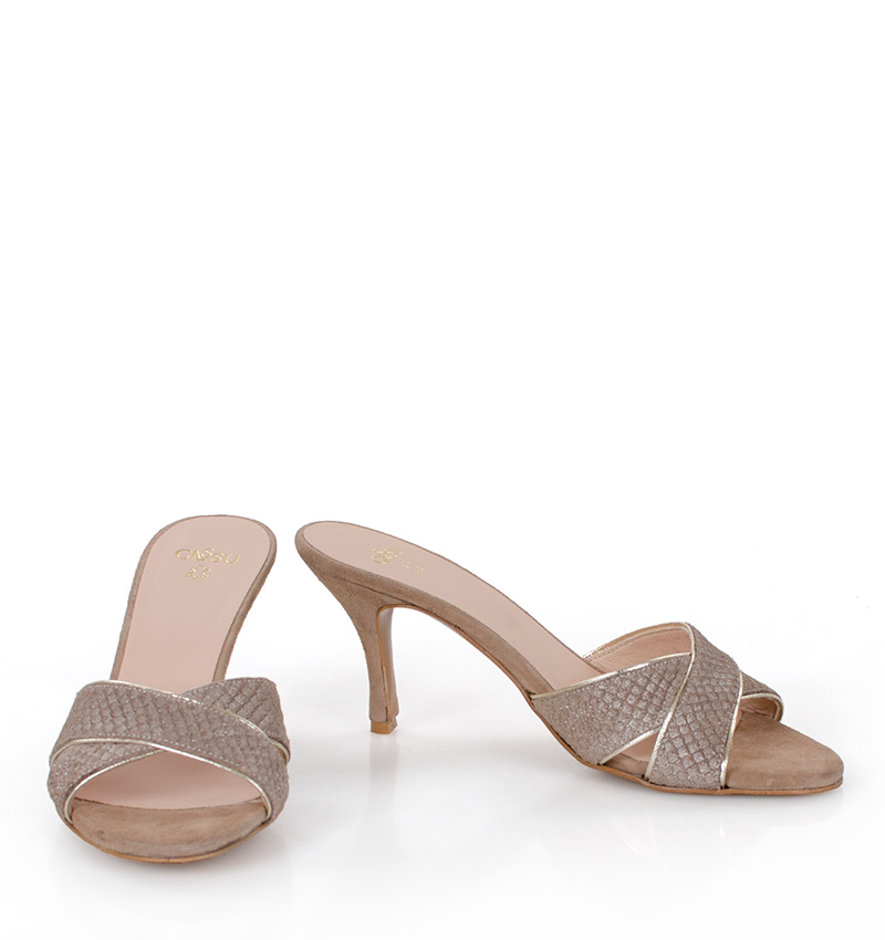 CHRISTINA – Beżowe klapki na szpilce. Cholewka w postaci dwóch skrzyżowanych, szerokich pasków ze złotą lamówką. Wykonane ze skóry naturalnej. Wysokość obcasa 7,5 cm jest mierzona w rozmiarze 37. Średniej wysokości szpilka sprawia, że klapki są wygodne. Tęgość butów: F1/2. Wnętrze butów i wkładka wykonane są również ze skóry naturalnej.