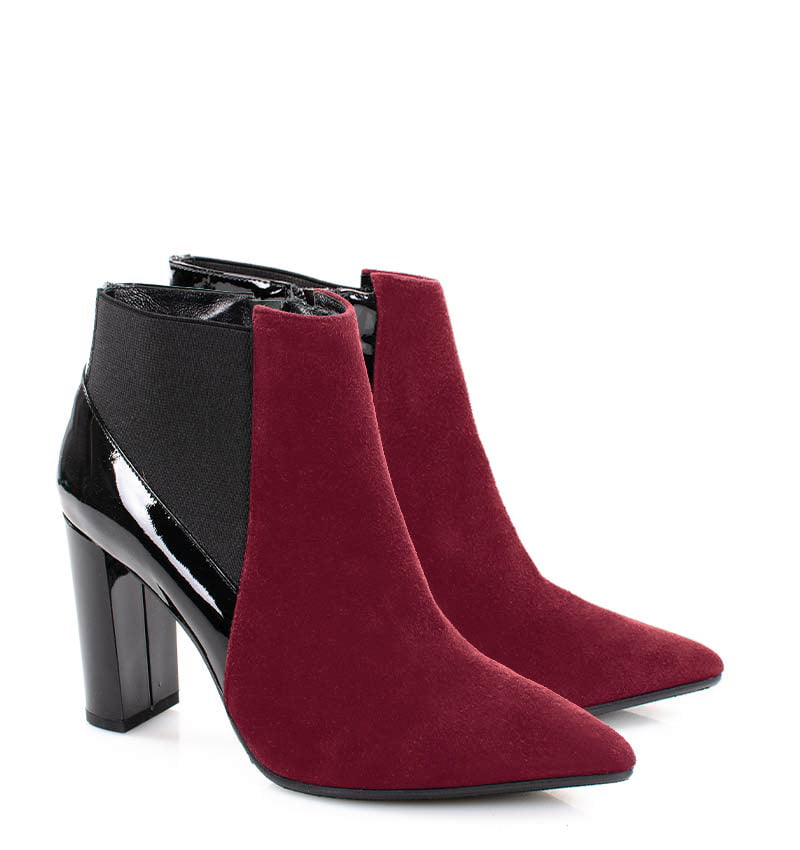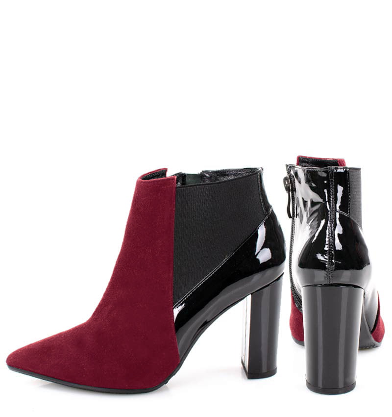 VERA – Bordowe botki na 9 cm słupku (wysokość obcasa jest mierzona w rozmiarze 37). Czubek w szpic, zapinane na zamek. Cholewka wykonana z dwóch rodzajów skór naturalnych. Przód butów to skóra zamszowa, tył butów to skóra lakierowana. Stabilny obcas, sprawia, że są to wygodne botki na słupku. Tęgość butów: G. Wnętrze butów nie jest ocieplone i wykończone skórą naturalną.
