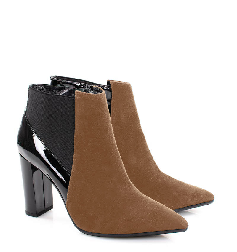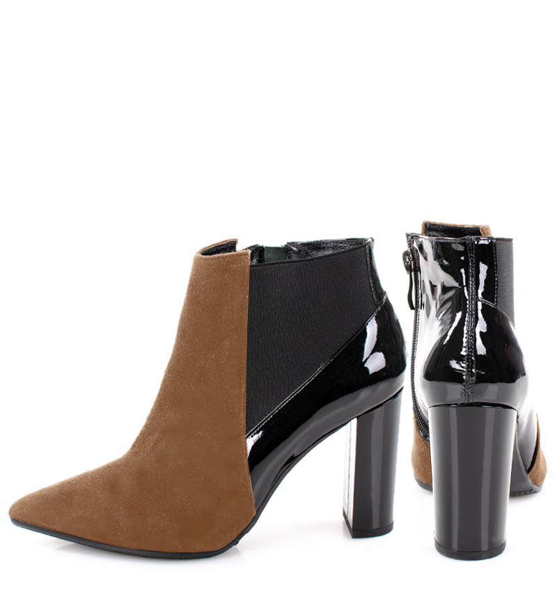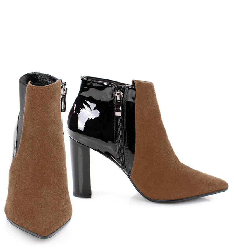 VERA – Brązowe botki na 9 cm słupku (wysokość obcasa jest mierzona w rozmiarze 37). Czubek w szpic, zapinane na zamek. Cholewka wykonana z dwóch rodzajów skór naturalnych. Przód butów to skóra welurowa, tył butów to skóra lakierowana. Stabilny obcas, sprawia, że są to wygodne botki na słupku. Tęgość butów: G. Wnętrze butów nie jest ocieplone i wykończone skórą naturalną.