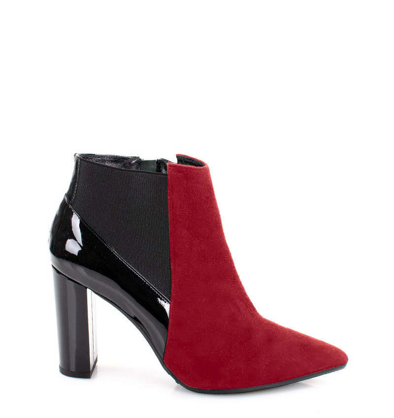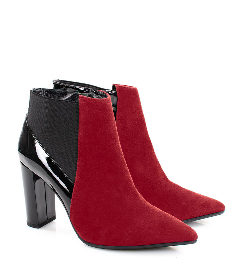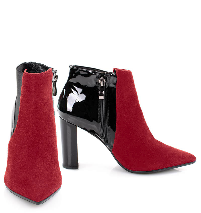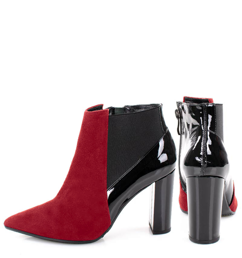 VERA – Czerwone botki na 9 cm słupku (wysokość obcasa jest mierzona w rozmiarze 37). Czubek w szpic, zapinane na zamek. Cholewka wykonana z dwóch rodzajów skór naturalnych. Przód butów to skóra zamszowa, tył butów to skóra lakierowana. Stabilny obcas, sprawia, że są to wygodne botki na słupku. Tęgość butów: G. Wnętrze butów nie jest ocieplone i wykończone skórą naturalną.