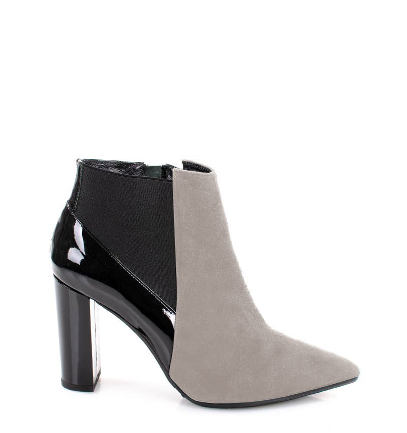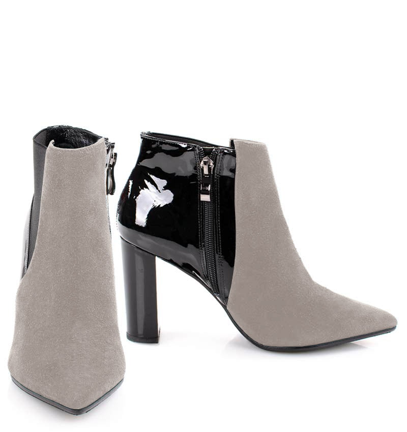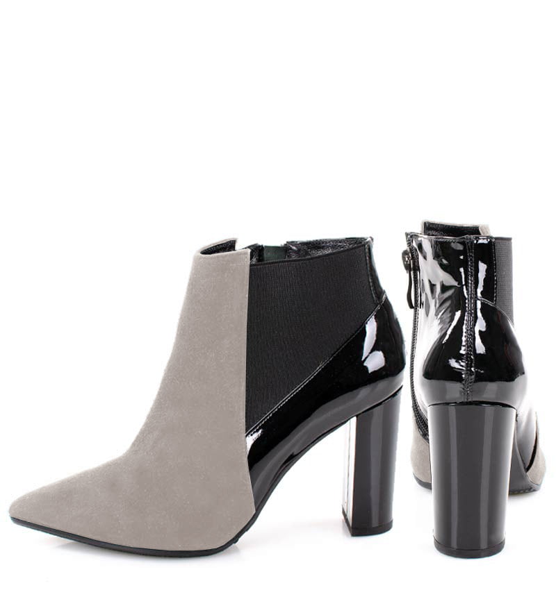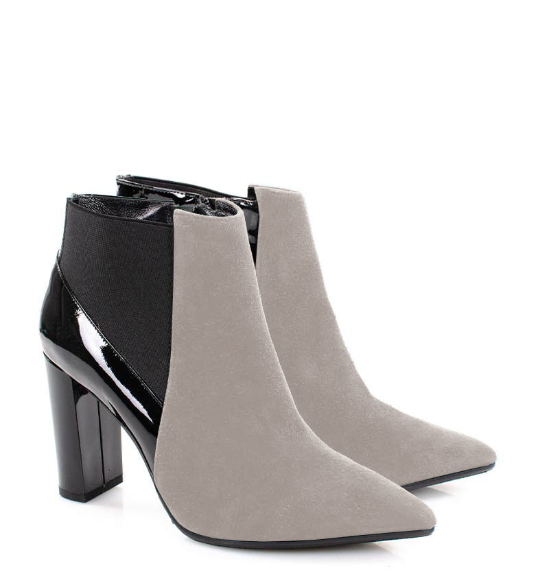 VERA –  Jasno szare botki na 9 cm słupku (wysokość obcasa jest mierzona w rozmiarze 37). Czubek w szpic, zapinane na zamek. Cholewka wykonana z dwóch rodzajów skór naturalnych. Przód butów to skóra zamszowa, tył butów to skóra lakierowana. Stabilny obcas, sprawia, że są to wygodne botki na słupku. Tęgość butów: G. Wnętrze butów nie jest ocieplone i wykończone skórą naturalną.