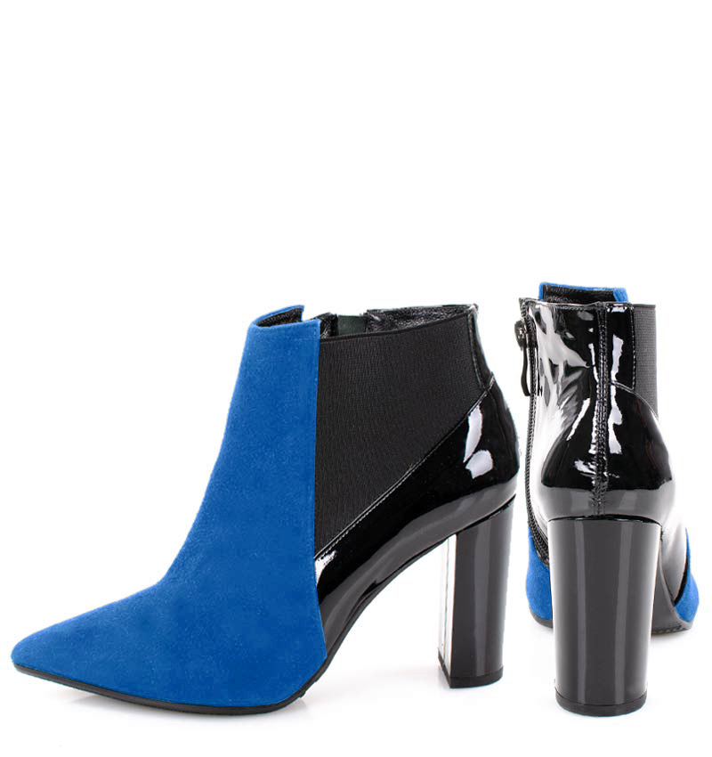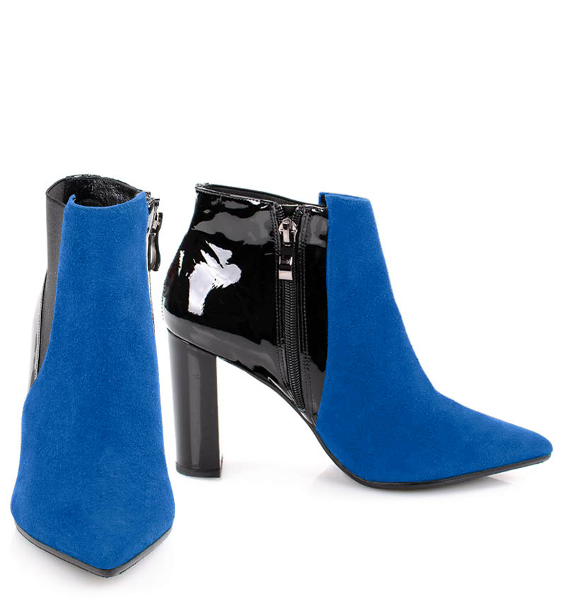 VERA – Niebieskie botki na 9 cm słupku (wysokość obcasa jest mierzona w rozmiarze 37). Czubek w szpic, zapinane na zamek. Cholewka wykonana z dwóch rodzajów skór naturalnych. Przód butów to skóra welurowa, tył butów to skóra lakierowana. Stabilny obcas, sprawia, że są to wygodne botki na słupku. Tęgość butów: G. Wnętrze butów nie jest ocieplone i wykończone skórą naturalną.