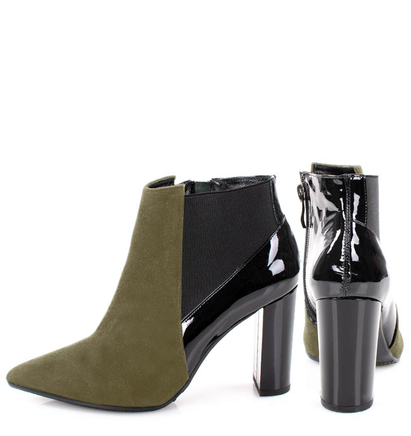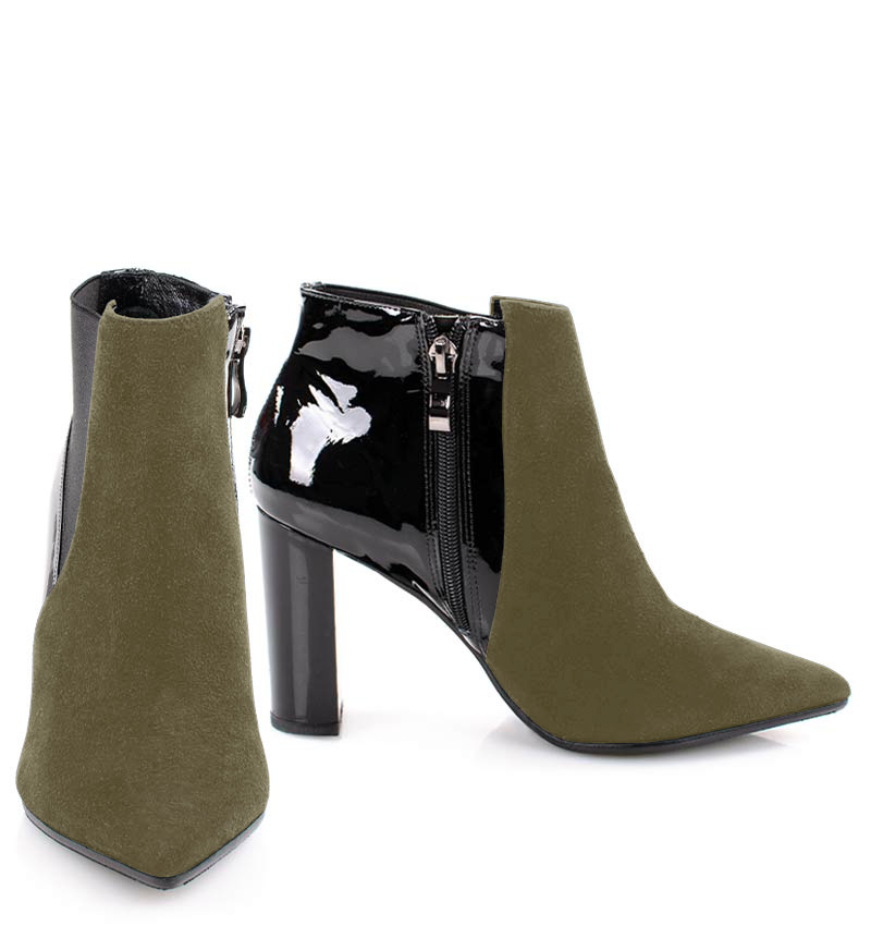 VERA – Zielone (khaki) botki na 9 cm słupku (wysokość obcasa jest mierzona w rozmiarze 37). Czubek w szpic, zapinane na zamek. Cholewka wykonana z dwóch rodzajów skór naturalnych. Przód butów to skóra welurowa, tył butów to skóra lakierowana. Stabilny obcas, sprawia, że są to wygodne botki na słupku. Tęgość butów: G. Wnętrze butów nie jest ocieplone i wykończone skórą naturalną.