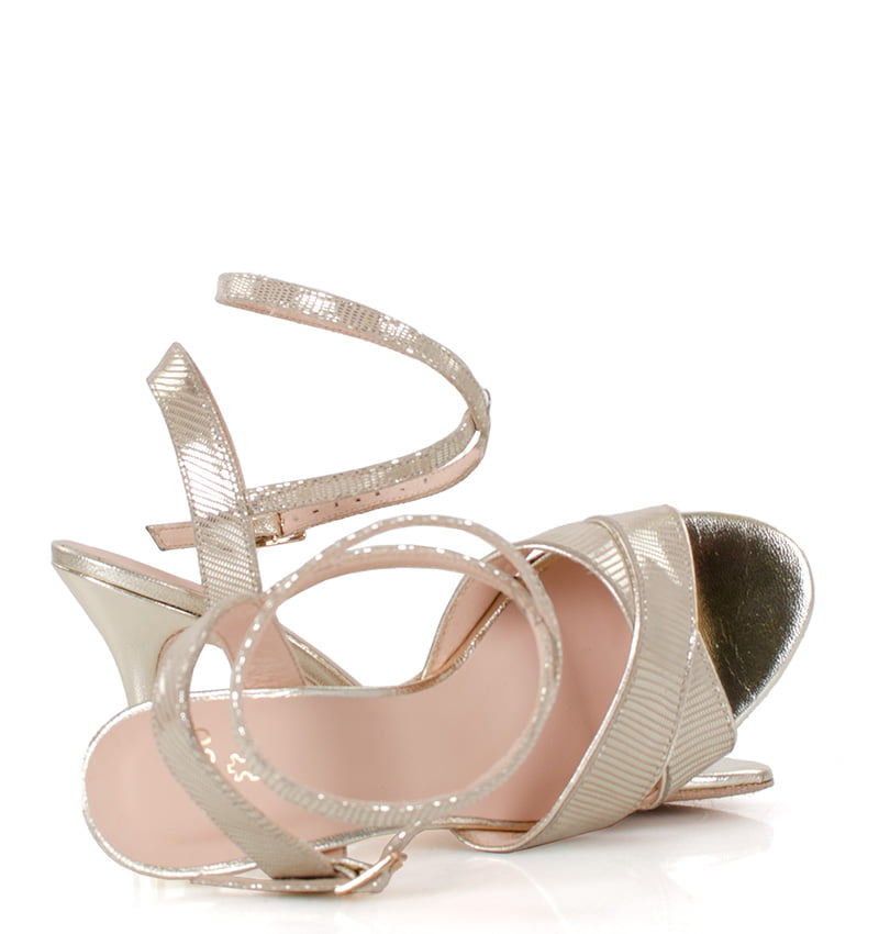 ELENA – Złote sandałki do tańca na skórzanej podeszwie. Buty dedykowane do tanga i łaciny. Podeszwa wykonana ze skóry welurowej, dzięki czemu jest elastyczna i miękka. Elena w wersji widocznej na zdjęciu, to buty do tańca przeznaczone do użytku wewnętrznego. Nie są przeznaczone do chodzenia po chodniku, chyba że zmienimy rodzaj podeszwy na skórę. Pasek nad kostką oplatany nad kostką, zapinany na sprzączkę. Obcas o wysokości 7,5 cm (wysokość obcasa jest mierzona dla rozmiaru 37).