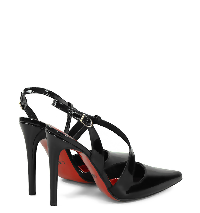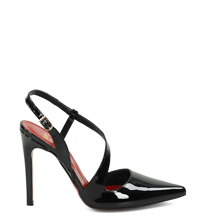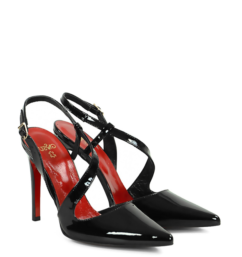 ELISE – Czarne lakierowane szpilki z odkrytą piętą na 10,5 cm obcasie (wysokość obcasa jest mierzona w rozmiarze 37). Czubek w szpic, zapinane na klamerkę. Buty wykonane z naturalnej skóry lakierowanej układającej się do stopy. Tęgość butów: F 1/2. Wnętrze butów wykończone skórą naturalną.