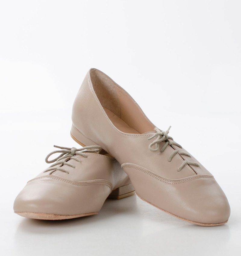 FLORES – beżowe buty treningowe  na płaskim obcasie o wysokości 1,5 cm (mierzone dla rozmiaru 37). Przeznaczone do ćwiczeń tanga i innych tańców. Skórzana, welurowa podeszwa jest elastyczna i miękka, bez usztywnienia. FLORES to wygodne, sznurowane buty do treningu tanecznego.