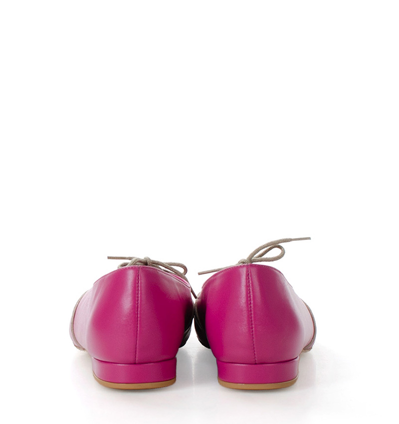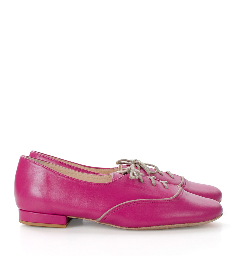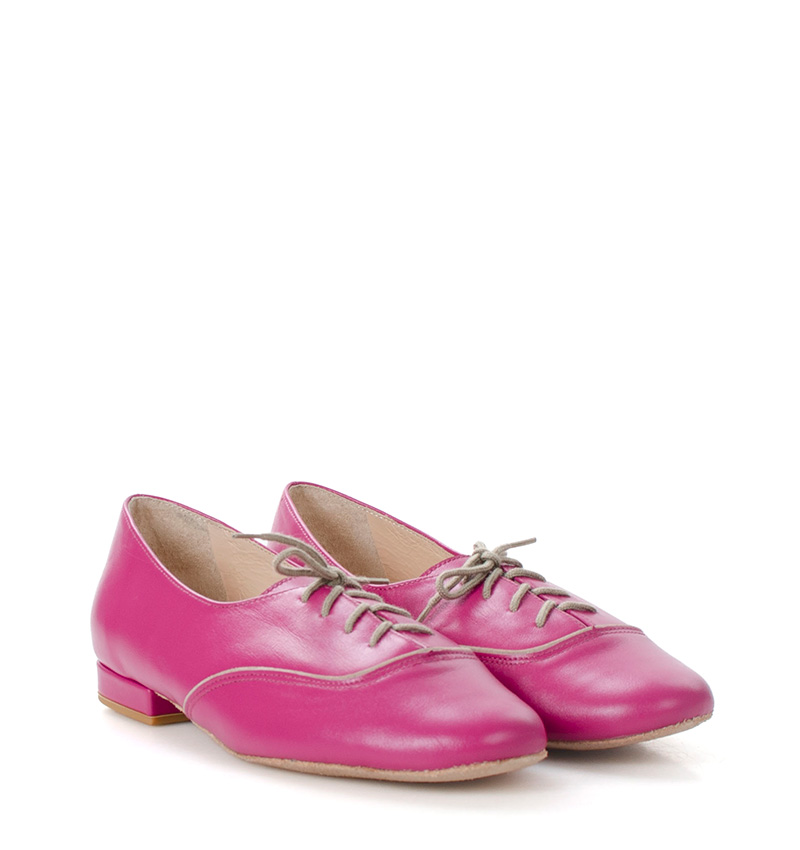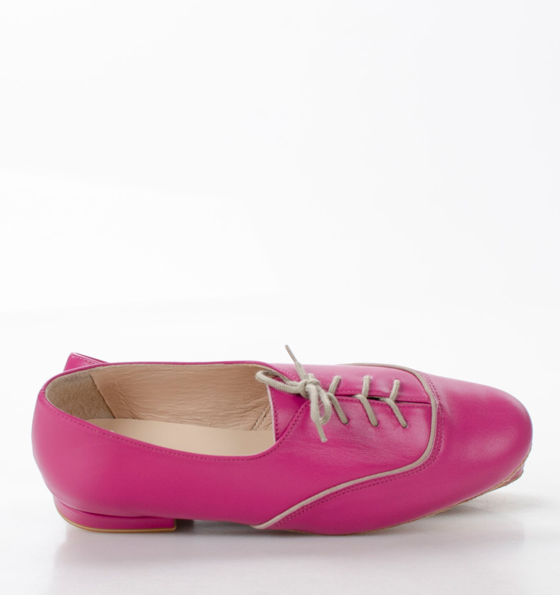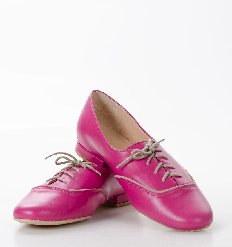 FLORES – różowe buty treningowe (lico, odcień fuksja) na płaskim obcasie o wysokości 1,5 cm (pomiar dla rozmiaru 37). Zaprojektowane z myślą o treningach tanga i innych form tańca. Posiadają miękką, elastyczną podeszwę wykonaną ze skóry welurowej – bez dodatkowego usztywnienia, co zapewnia maksymalną swobodę ruchu.