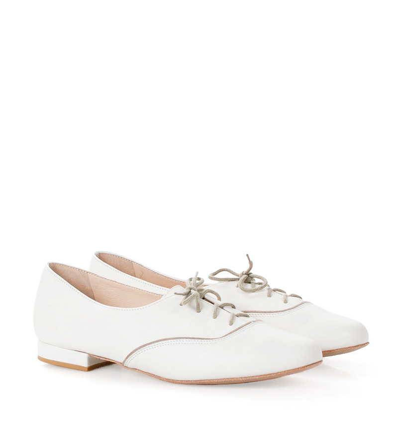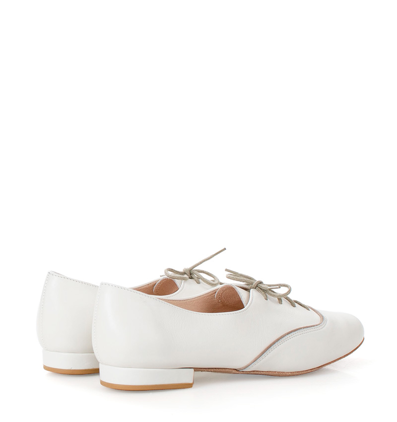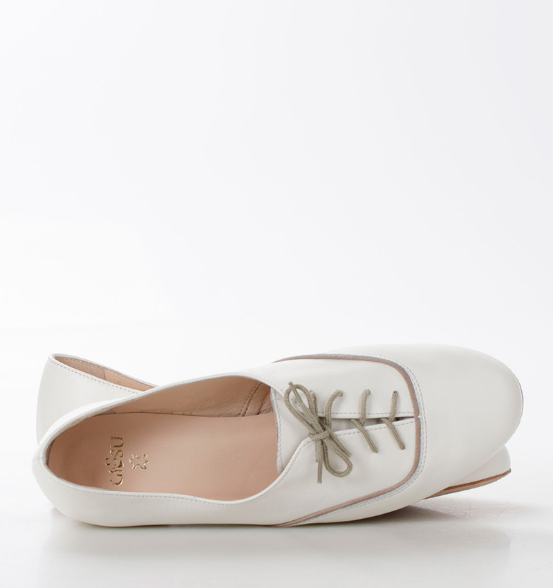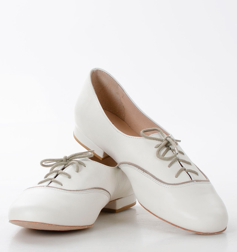 FLORES – kremowe buty treningowe na płaskim obcasie o wysokości 1,5 cm (mierzone dla rozmiaru 37). Przeznaczone do ćwiczeń tanga i innych tańców. Skórzana, welurowa podeszwa jest elastyczna i miękka, bez usztywnienia. FLORES to wygodne, sznurowane buty do treningu tanecznego.