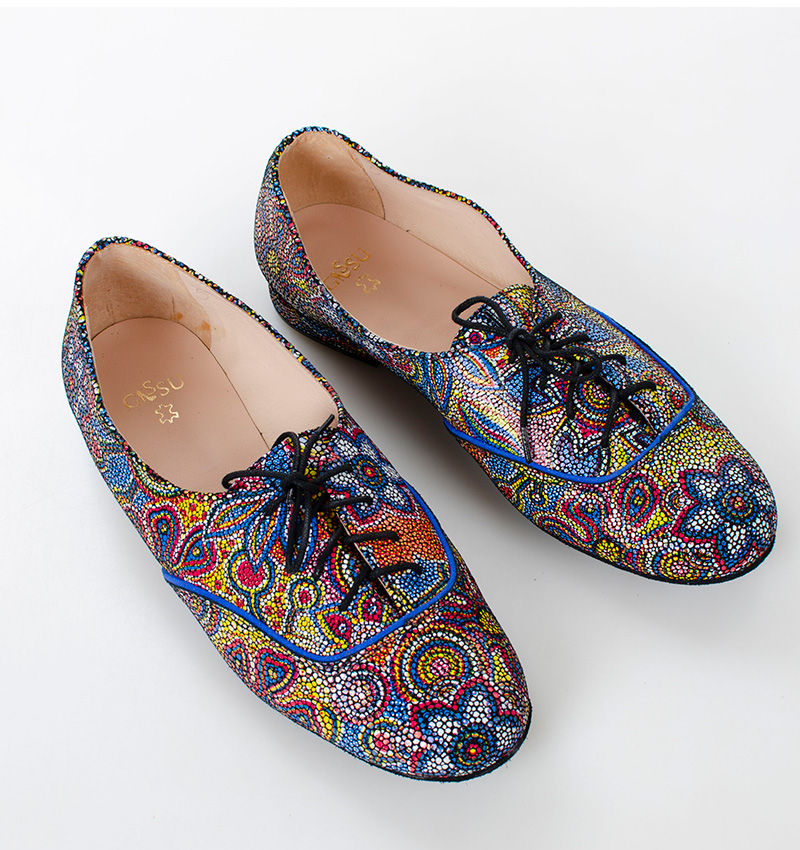 FLORES – buty treningowe na płaskim obcasie o wysokości 1,5 cm (mierzone dla rozmiaru 37) w kolorze niebieskim i wzorze w kolorowe kwiaty. Przeznaczone do ćwiczeń różnego rodzaju tańców. Skórzana podeszwa jest elastyczna i miękka, bez usztywnienia. FLORES to wygodne, sznurowane buty do treningu tanecznego.