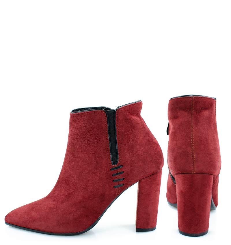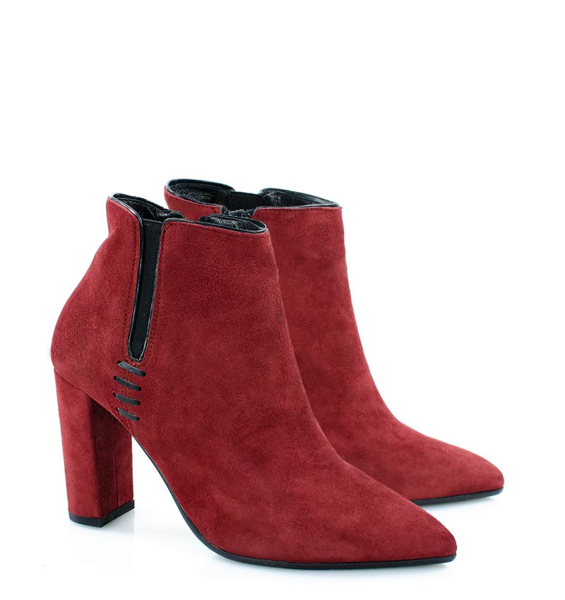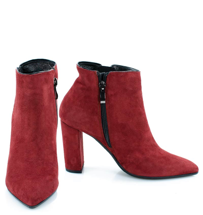 FRANCES –  Czerwone botki jesienno zimowe na 9,5 cm słupku (wysokość obcasa jest mierzona w rozmiarze 37). Czubek w szpic, zapinane na zamek . Buty wykonane z naturalnej skóry welurowej układającej się do stopy. Średnia wysokość obcasa sprawia, że są to wygodne botki. Tęgość butów: F 1/2. Wnętrze butów jest nieocieplone, wkładka ze skóry naturalnej.