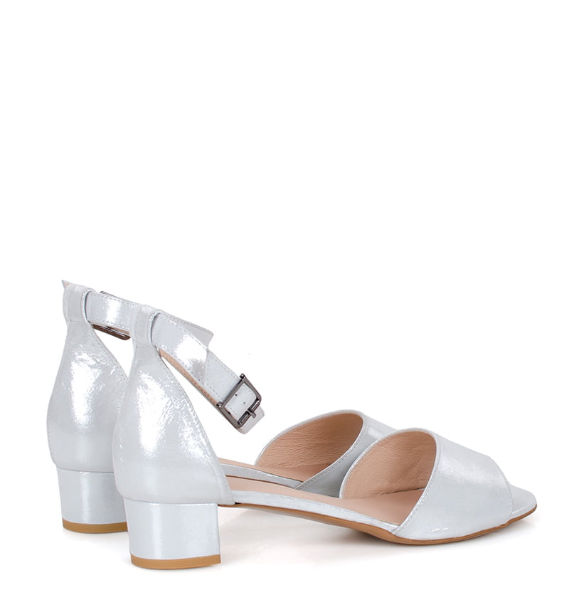 GINA –  srebrne sandały na niskim obcasie, wykonane z satynowanej skóry naturalnej. Obcas 3,5 cm (wysokość obcasa jest mierzona dla rozmiaru 37). Wygodne sandałki z zakryta piętą i paskiem wokół kostki.  Tęgość butów to F 1/2. Srebrne sandały na małym obcasie są bardzo wygodne i zapewniają wysoki komfort noszenia.