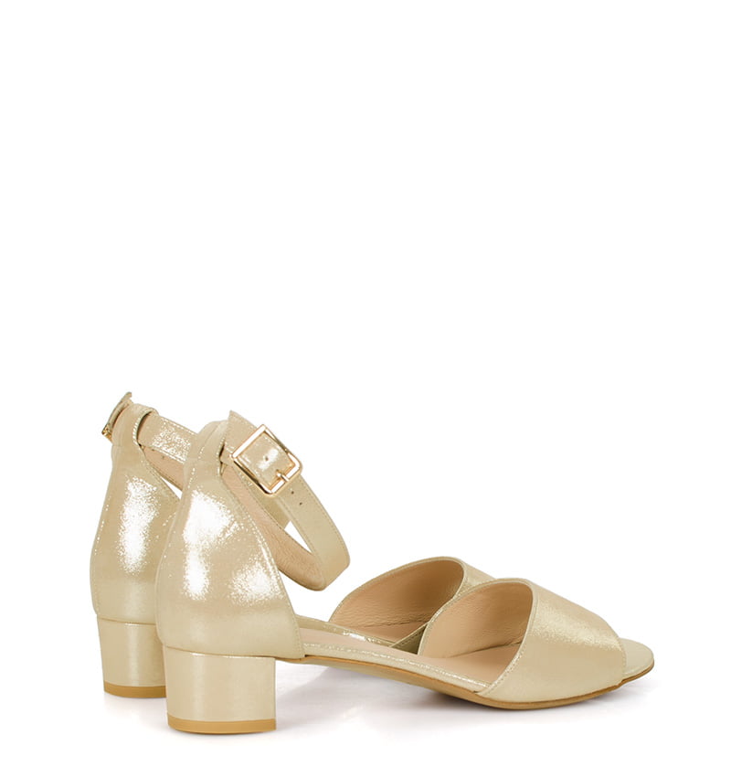 GINA –  złote sandały na niskim obcasie, wykonane z satynowanej skóry naturalnej. Obcas 3,5 cm (wysokość obcasa jest mierzona dla rozmiaru 37). Wygodne sandałki z zakryta piętą i paskiem wokół kostki.  Tęgość butów to F 1/2. Złote sandały na małym obcasie są bardzo wygodne i zapewniają wysoki komfort noszenia.