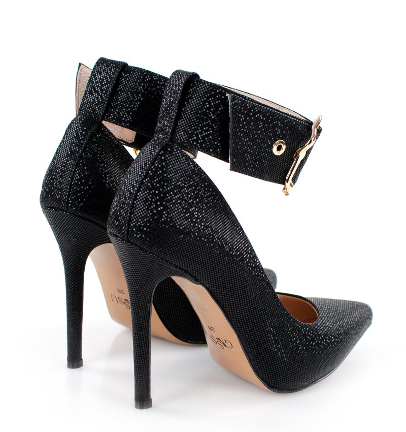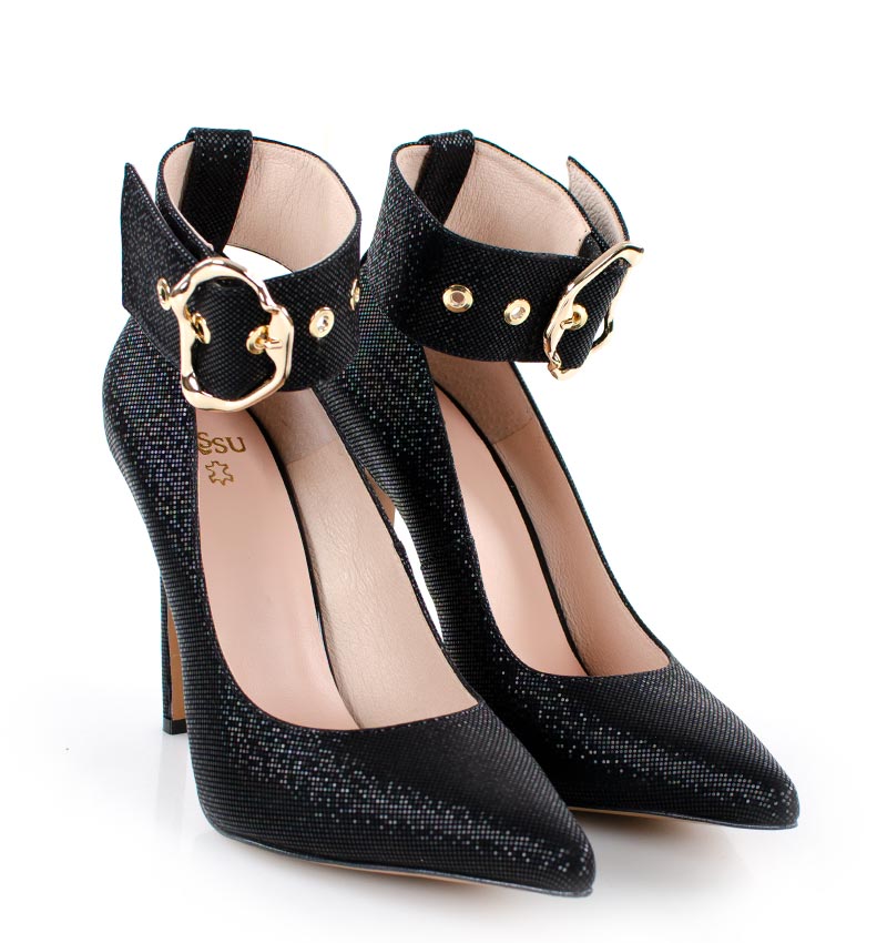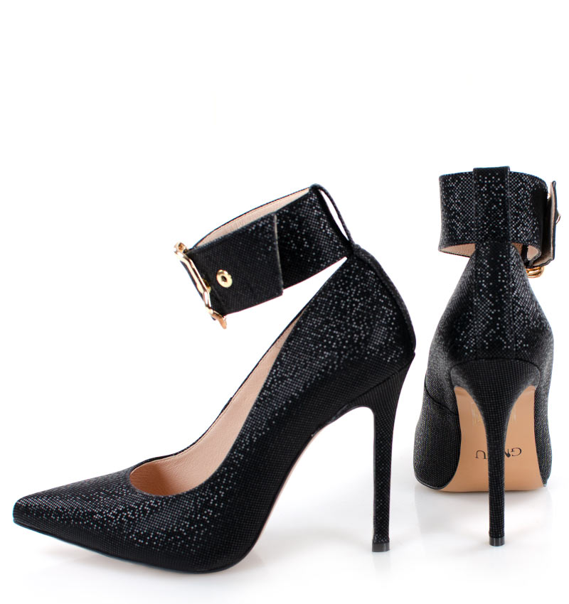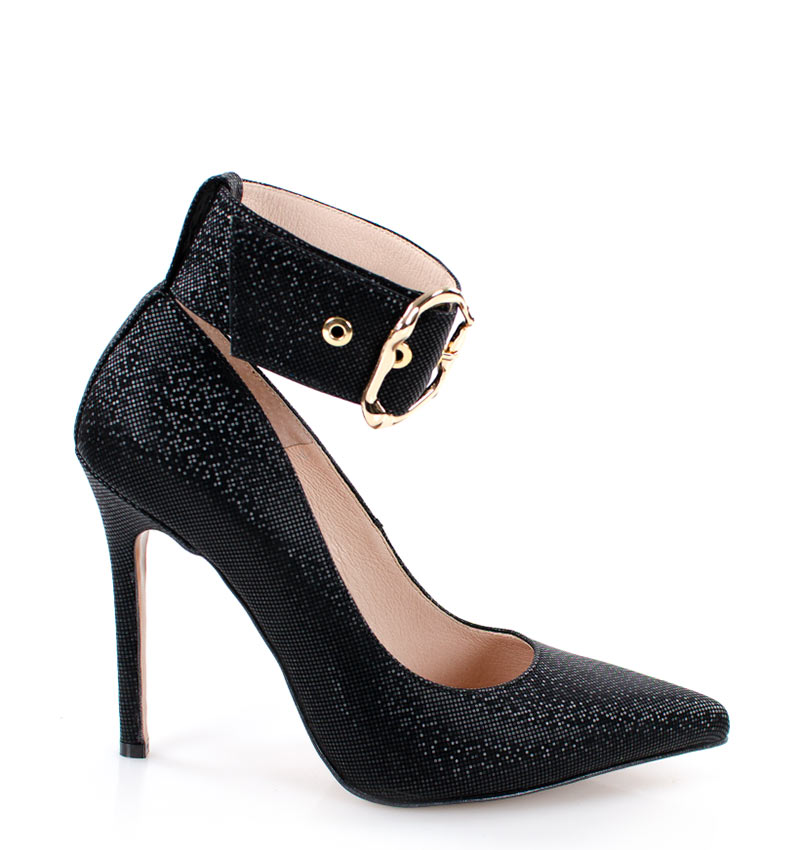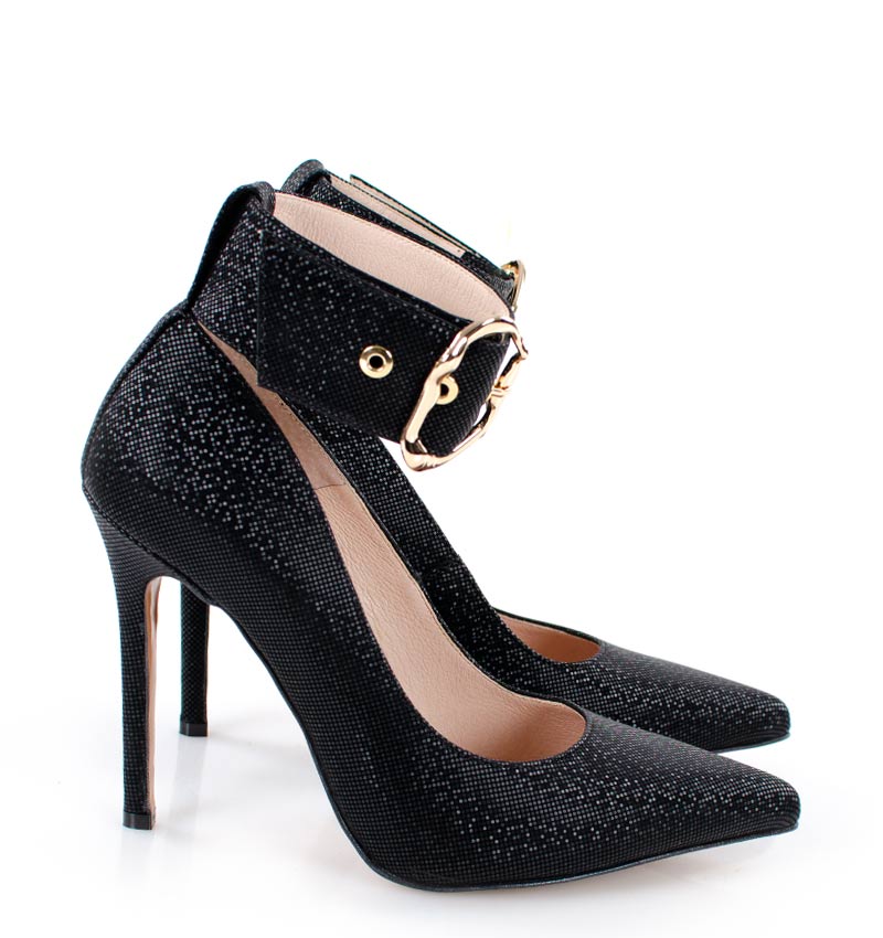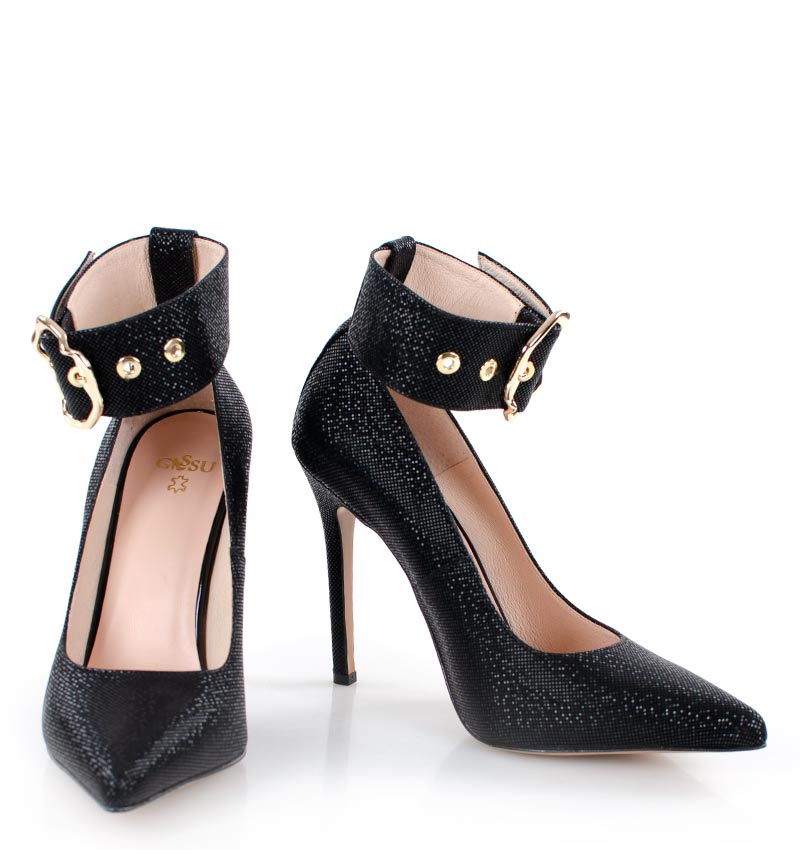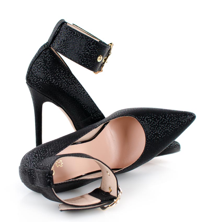 GLORIA – Czarne szpilki na cienkiej 11 cm szpilce (wysokość obcasa jest mierzona w rozmiarze 37). Czubek w szpic, zapinane szerokim na 4 cm paskiem z klamerką. Buty wykonane z naturalnej skóry układającej się do stopy. Wysokość obcasa sprawia, że są to efektowne szpilki. Tęgość butów: F 1/2. Wnętrze butów i wkładka wykonane są ze skóry naturalnej.