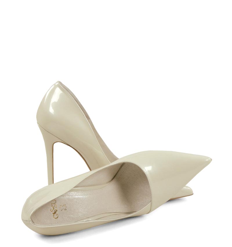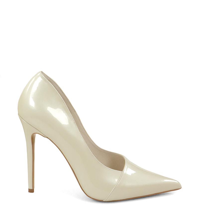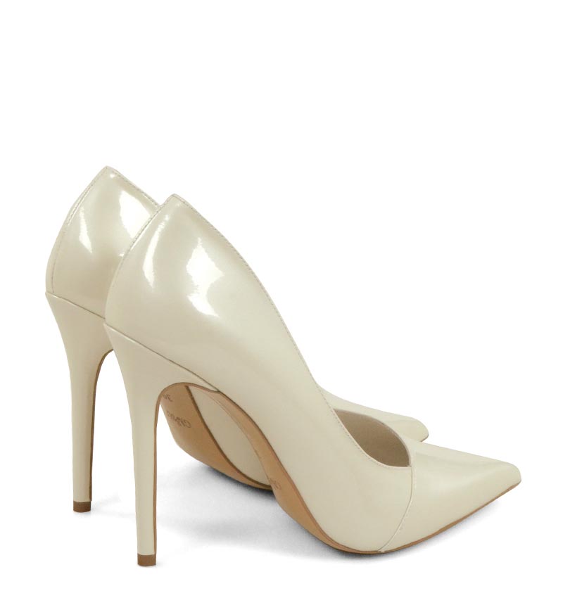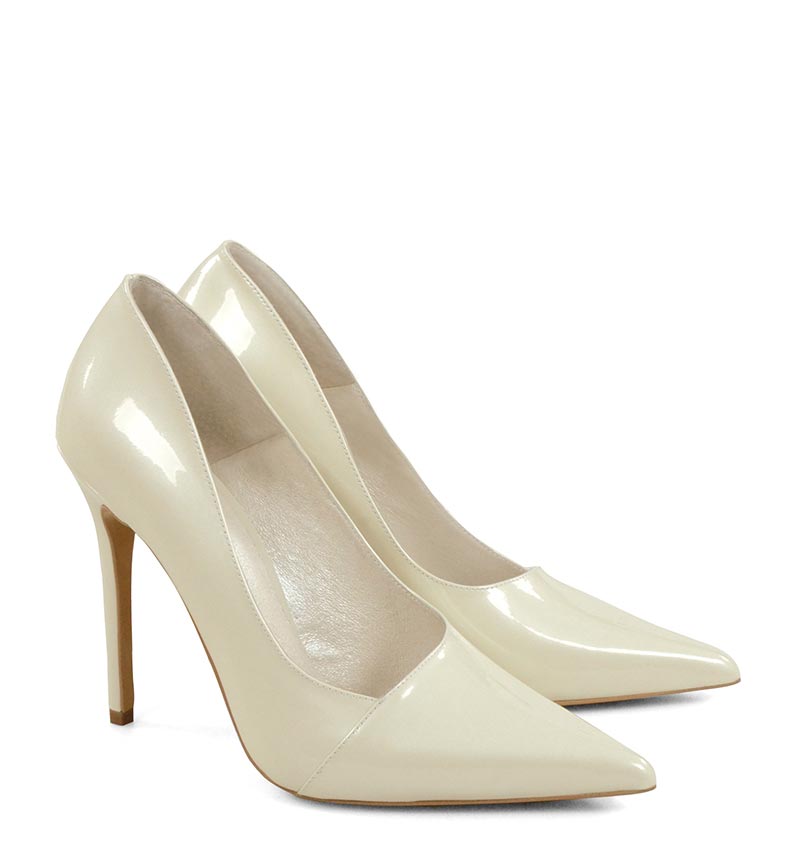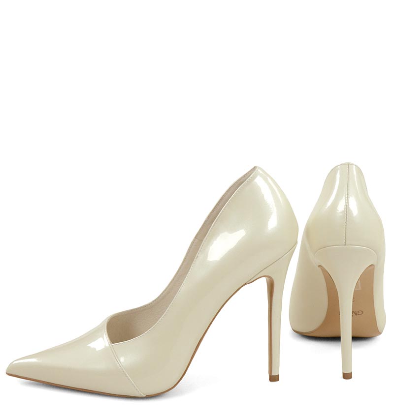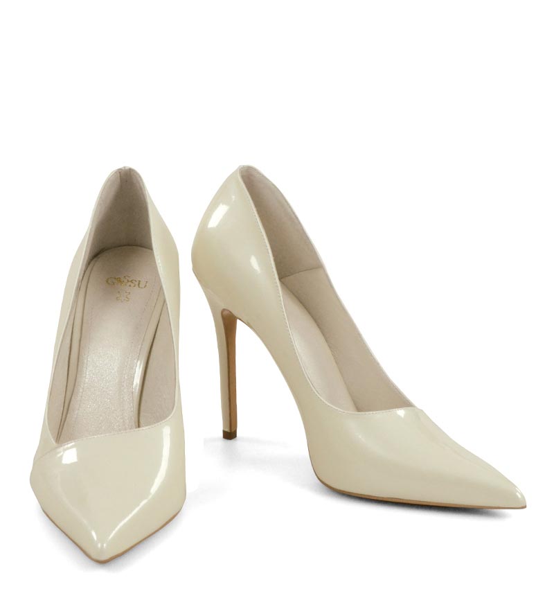 HAILEY – błyszczące, ecru wysokie szpilki na 11,5 cm obcasie (wysokość obcasa jest mierzona w rozmiarze 37). Czubek w szpic. Szpilki wykonane z naturalnej skóry perłowej. Wysokość obcasa sprawia, że są to bardzo efektowne czółenka na szpilce. Tęgość butów: F 1/2. Wnętrze butów i wkładka wykonane są z koziej skóry naturalnej.