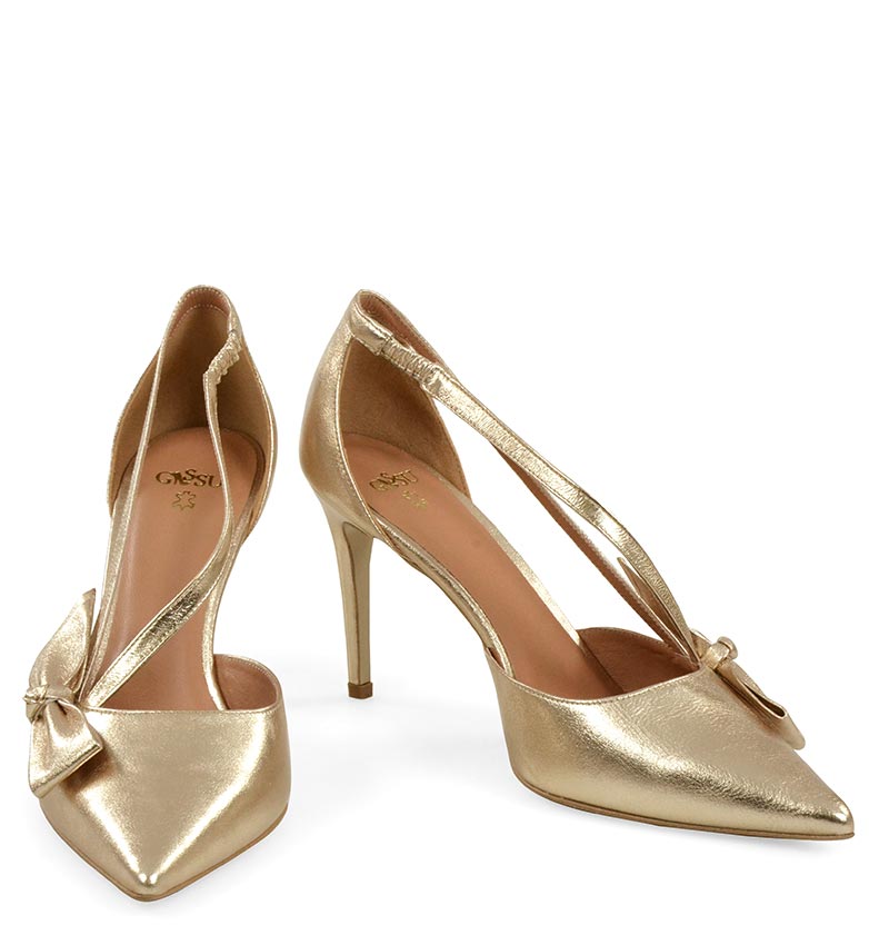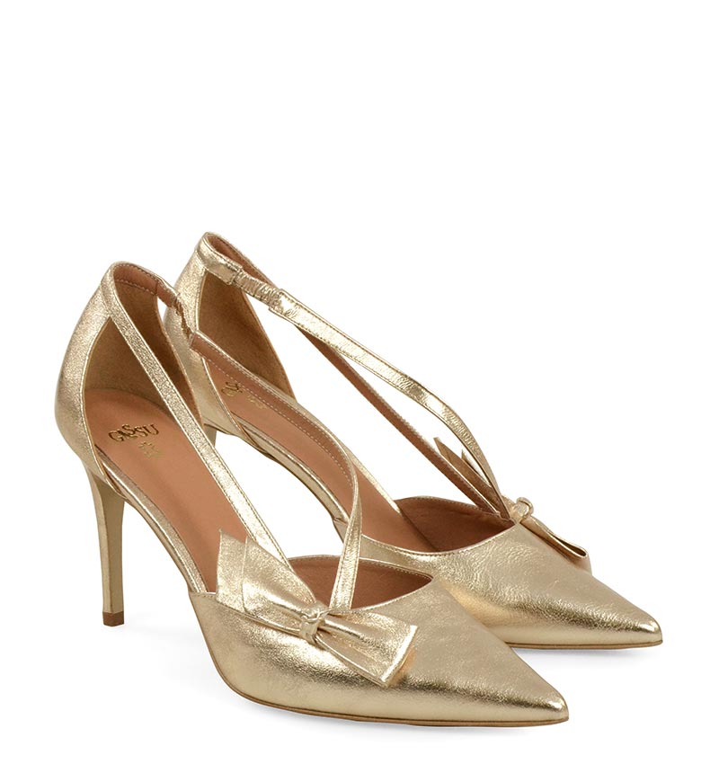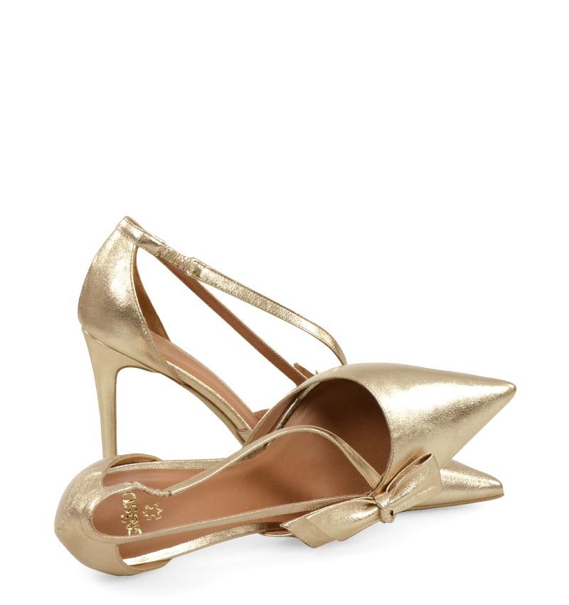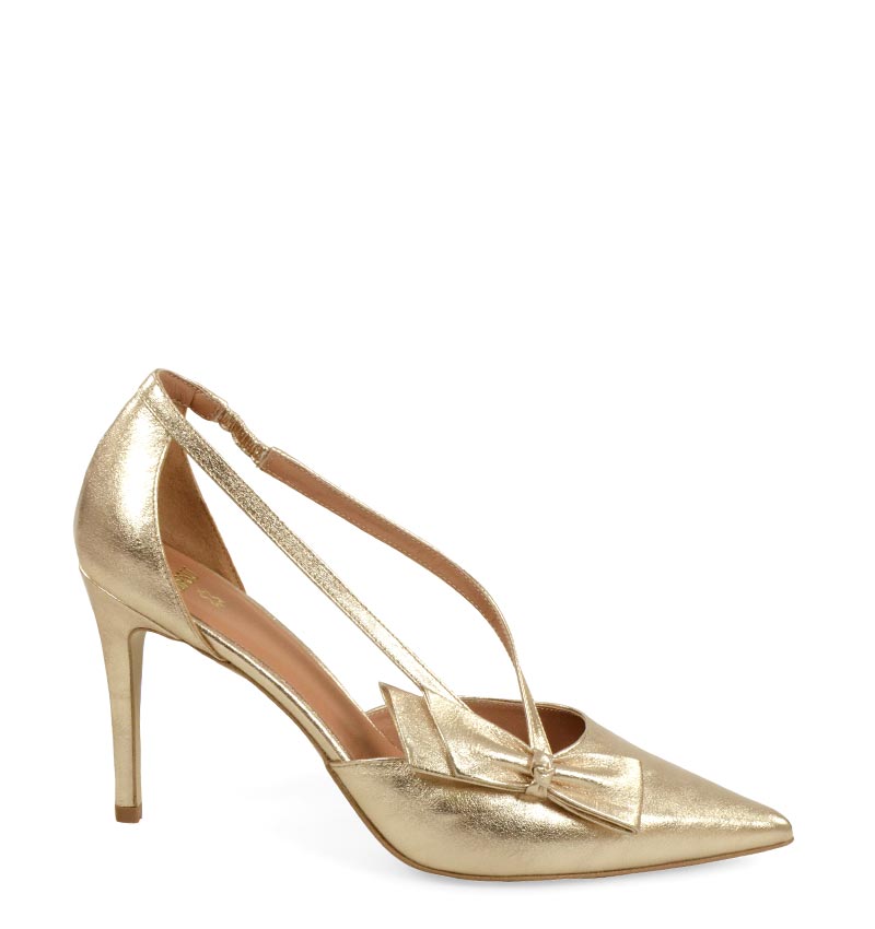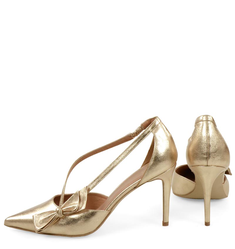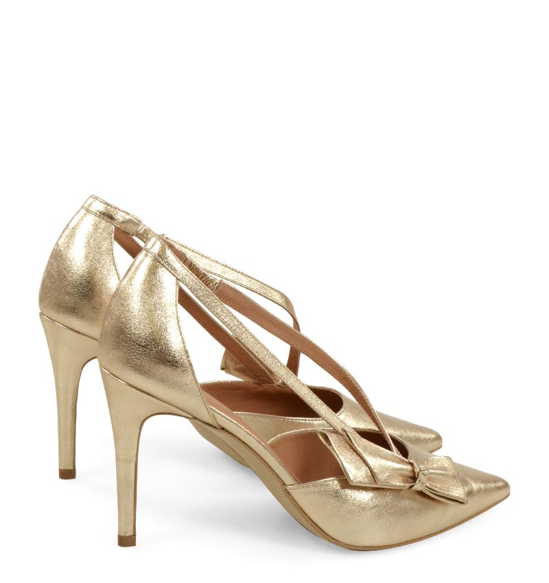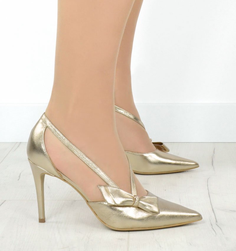 IDA –  Złote szpilki na 9 cm słupku (wysokość obcasa jest mierzona w rozmiarze 37). Czubek w szpic lekko wydłużany, wsuwane (pasek z gumką). Buty wykonane z naturalnej skóry licowej układającej się do stopy. Szpilki eleganckie, pięknie prezentują się do sukni ślubnych i balowych. Tęgość butów: F 1/2. Wnętrze butów wykończone delikatną skórą naturalną.