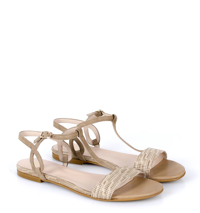 JANET – Beżowe sandałki na płaskim obcasie z paskiem t-strap. Czubek okrągły. Buty wykonane z naturalnej skóry licowej, układającej się do stopy. Płaski obcas sprawia, że są to bardzo wygodne sandałki na lato. Tęgość butów: F 1/1. Wnętrze butów i wkładka wykonane są ze skóry naturalnej.