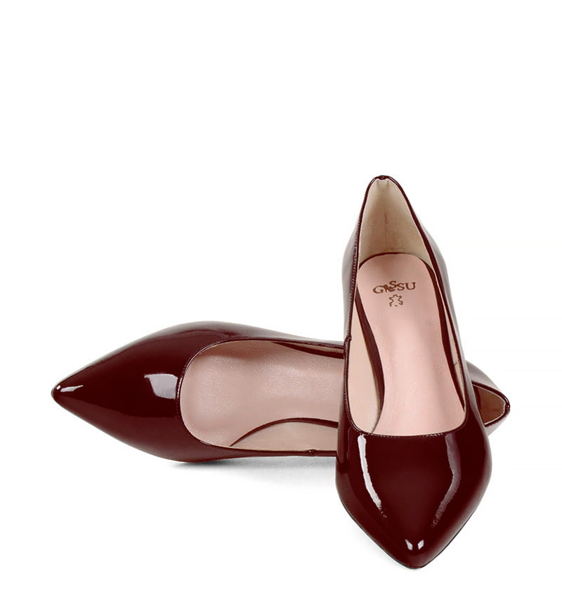 JESSICA – Bordowe niskie szpilki na 4 cm obcasie (wysokość obcasa jest mierzona w rozmiarze 37). Czubek w szpic. Buty wykonane z naturalnej skóry lakierowanej, układającej się do stopy. Niska wysokość obcasa sprawia, że są to bardzo wygodne czółenka na szpilce. Tęgość butów: G. Wnętrze butów i wkładka wykonane są ze skóry naturalnej.