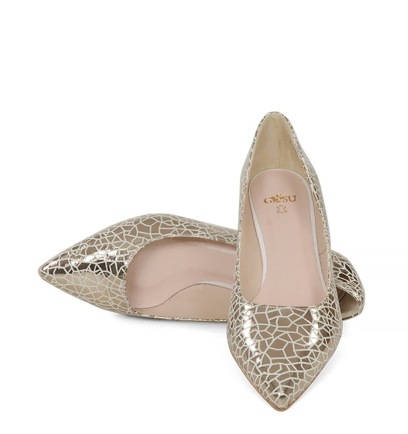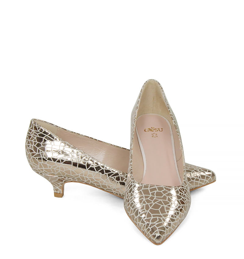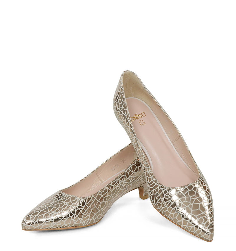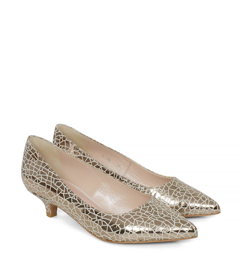 JESSICA – Złote niskie szpilki na 4 cm obcasie (wysokość obcasa jest mierzona w rozmiarze 37). Czubek w szpic. Buty wykonane z naturalnej skóry wzorzystej, układającej się do stopy. Niska wysokość obcasa sprawia, że są to bardzo wygodne czółenka na szpilce. Tęgość butów: G. Wnętrze butów i wkładka wykonane są ze skóry naturalnej.