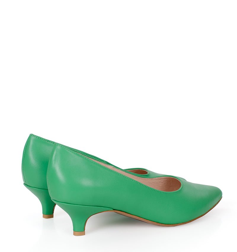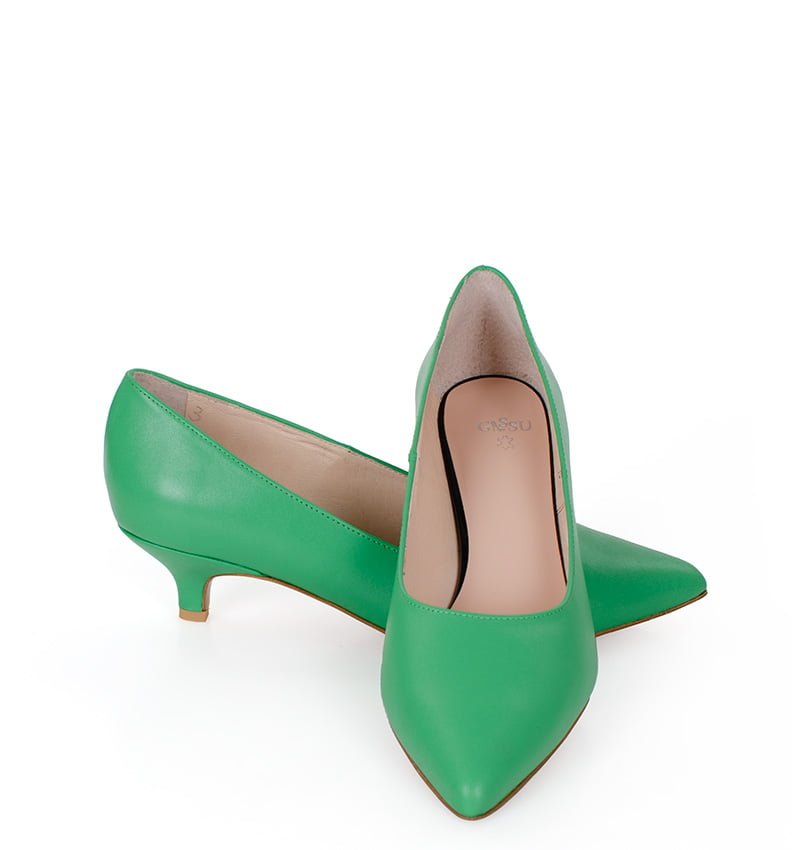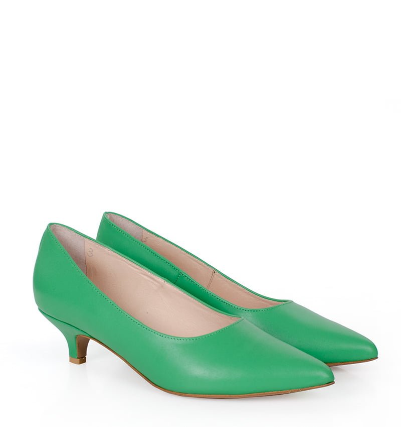 JESSICA –  Zielone szpilki na niskim, 4 cm obcasie (wysokość obcasa jest mierzona w rozmiarze 37). Czubek w nieduży szpic. Buty wykonane z naturalnej skóry licowej, układającej się do stopy. Niska wysokość obcasa sprawia, że są to bardzo wygodne czółenka na szpilce do codziennego użytku jak i na wielkie wyjcie. Tęgość butów: G. Wnętrze butów i wkładka wykonane są ze skóry naturalnej.