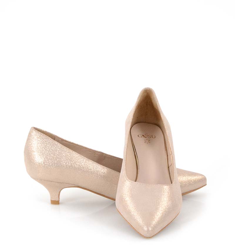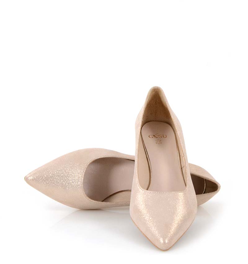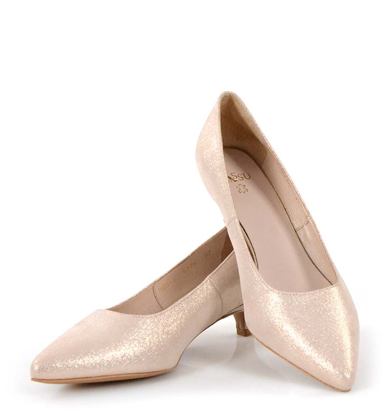 JESSICA – Jasno złote niskie szpilki na 4 cm obcasie (wysokość obcasa jest mierzona w rozmiarze 37). Czubek w szpic. Buty wykonane z naturalnej skóry satynowej, układającej się do stopy. Niska wysokość obcasa sprawia, że są to bardzo wygodne czółenka na szpilce. Tęgość butów: G. Wnętrze butów i wkładka wykonane są ze skóry naturalnej.