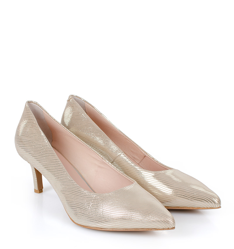 JOAN –  Złote szpilki na 7 cm obcasie (wysokość obcasa jest mierzona w rozmiarze 37). Czubek w szpic. Buty wykonane z naturalnej skóry układającej się do stopy. Średnia wysokość obcasa sprawia, że są to bardzo wygodne szpilki. Tęgość butów: F 1/2. Wnętrze butów i wkładka wykonane są ze skóry naturalnej.