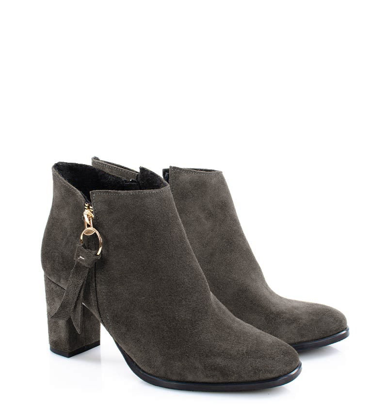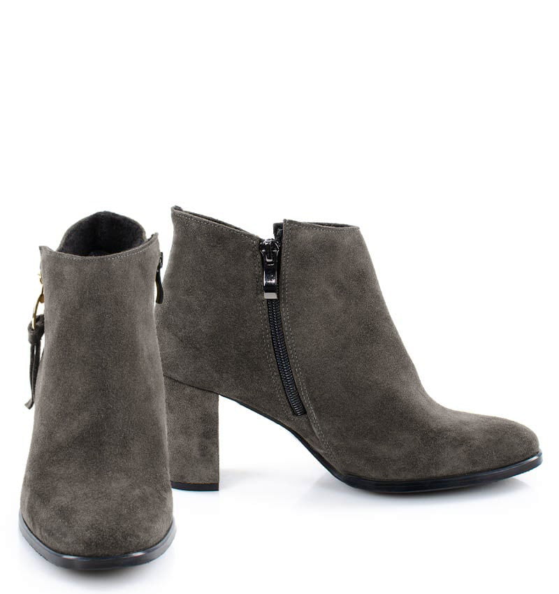 JUDITH – Ciemno szare botki do kostki, na 7,5 cm słupku. (wysokość obcasa jest mierzona w rozmiarze 37). Botki wykonane z welurowej skóry naturalnej. Czubek w zaokrąglony. Średnia wysokość obcasa sprawia, że są to wygodne botki na słupku. Tęgość butów: G. Wnętrze butów jest lekko ocieplone cienkim kocem obuwniczym.