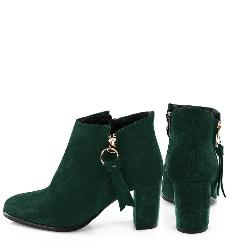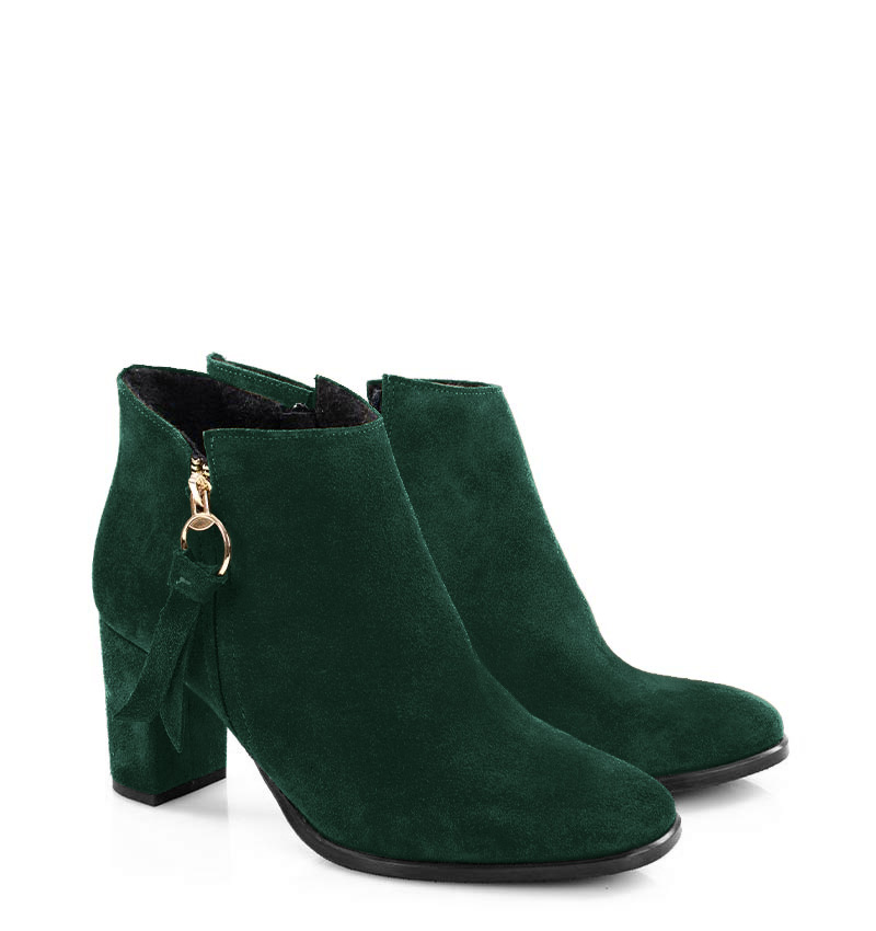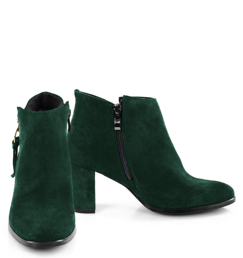 JUDITH – Ciemno zielone botki do kostki, na 7,5 cm słupku. (wysokość obcasa jest mierzona w rozmiarze 37). Botki wykonane z welurowej skóry naturalnej. Czubek w zaokrąglony. Średnia wysokość obcasa sprawia, że są to wygodne botki na słupku. Tęgość butów: G. Wnętrze butów jest lekko ocieplone cienkim kocem obuwniczym.
