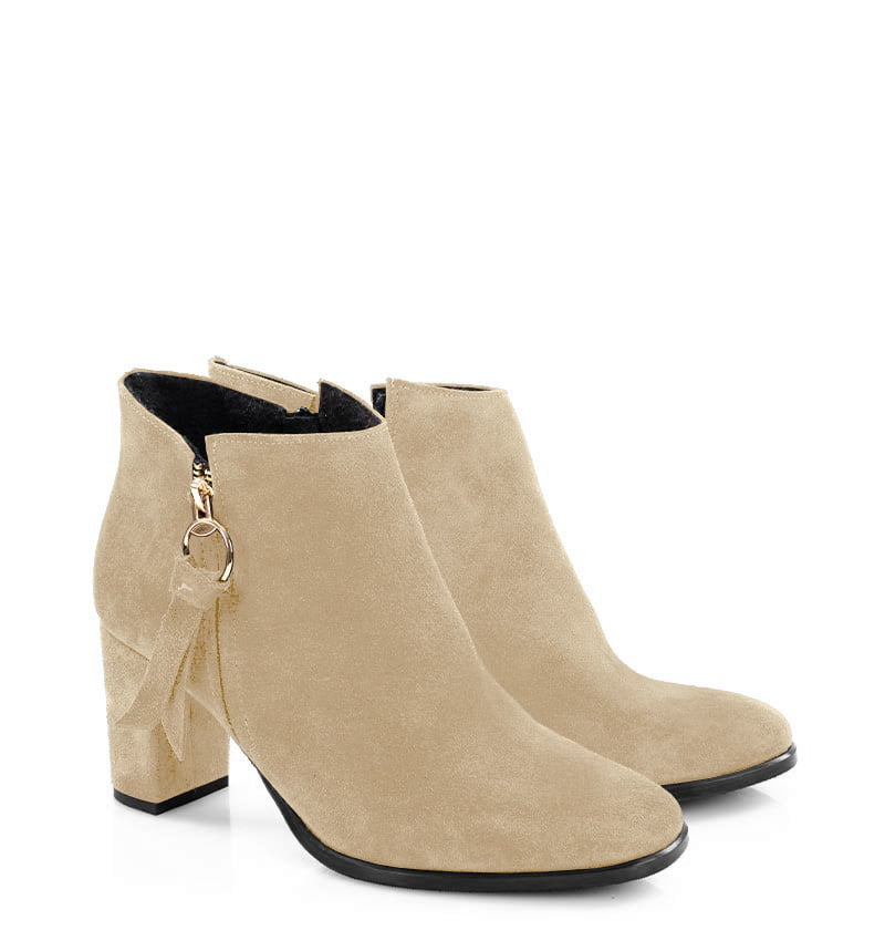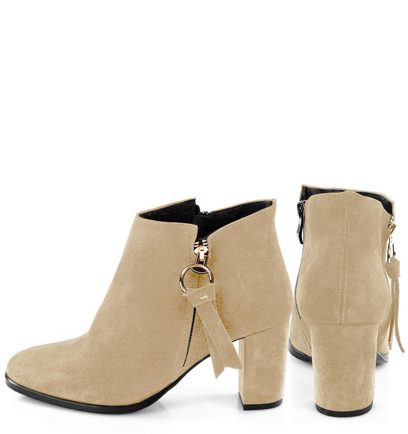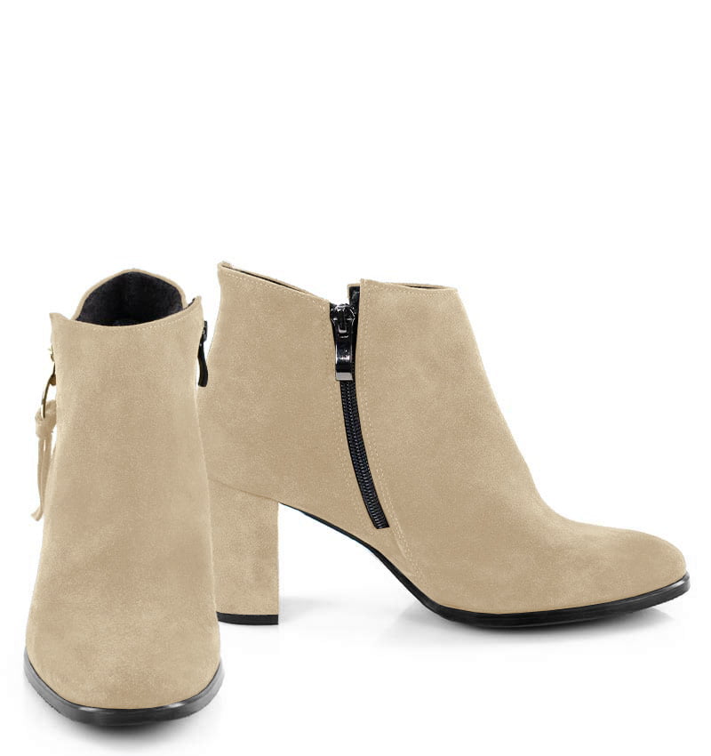 JUDITH – Jasno beżowe botki do kostki, na 7,5 cm słupku. (wysokość obcasa jest mierzona w rozmiarze 37). Botki wykonane z welurowej skóry naturalnej. Czubek w zaokrąglony. Średnia wysokość obcasa sprawia, że są to wygodne botki na słupku. Tęgość butów: G. Wnętrze butów jest lekko ocieplone cienkim kocem obuwniczym.