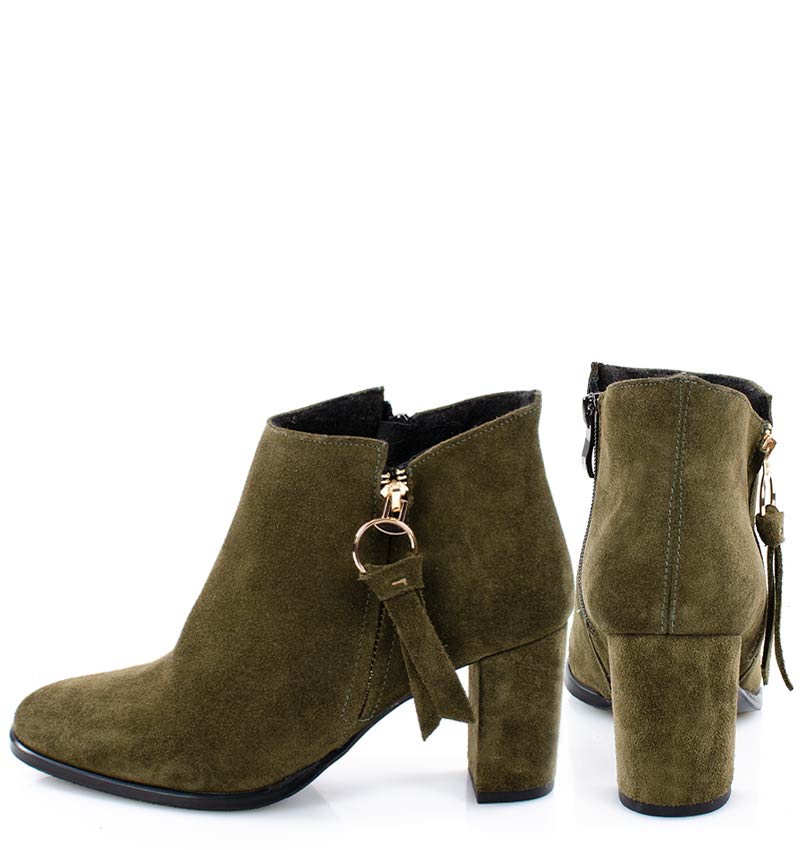 JUDITH – Ciemno zielone botki do kostki, na 7,5 cm słupku. (wysokość obcasa jest mierzona w rozmiarze 37). Botki wykonane z welurowej skóry naturalnej. Czubek w zaokrąglony.  Średnia wysokość obcasa sprawia, że są to wygodne botki na słupku. Tęgość butów: G. Wnętrze butów jest lekko ocieplone cienkim kocem obuwniczym.