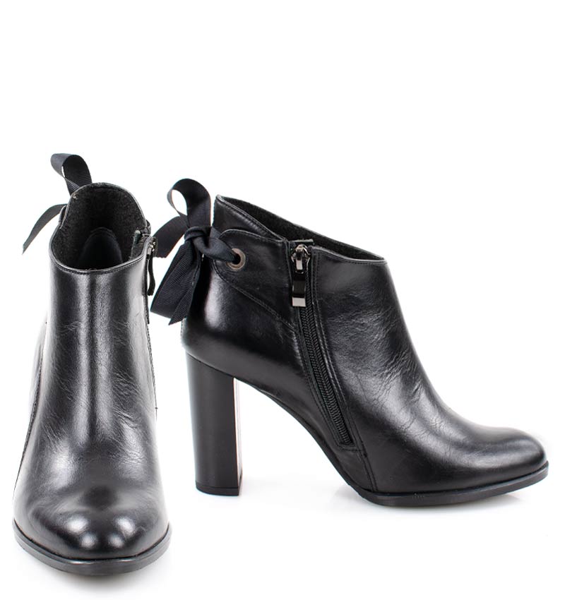 KELLY – Czarne botki na 9 cm słupku. (wysokość obcasa jest mierzona w rozmiarze 37). Botki wykonane z licowej skóry naturalnej. Czubek migdałowy.  Wysoki obcas sprawia, że botki ładnie prezentują się na nodze. Tęgość butów: G. Wnętrze butów wykończone skórą naturalną i nie jest ocieplone.