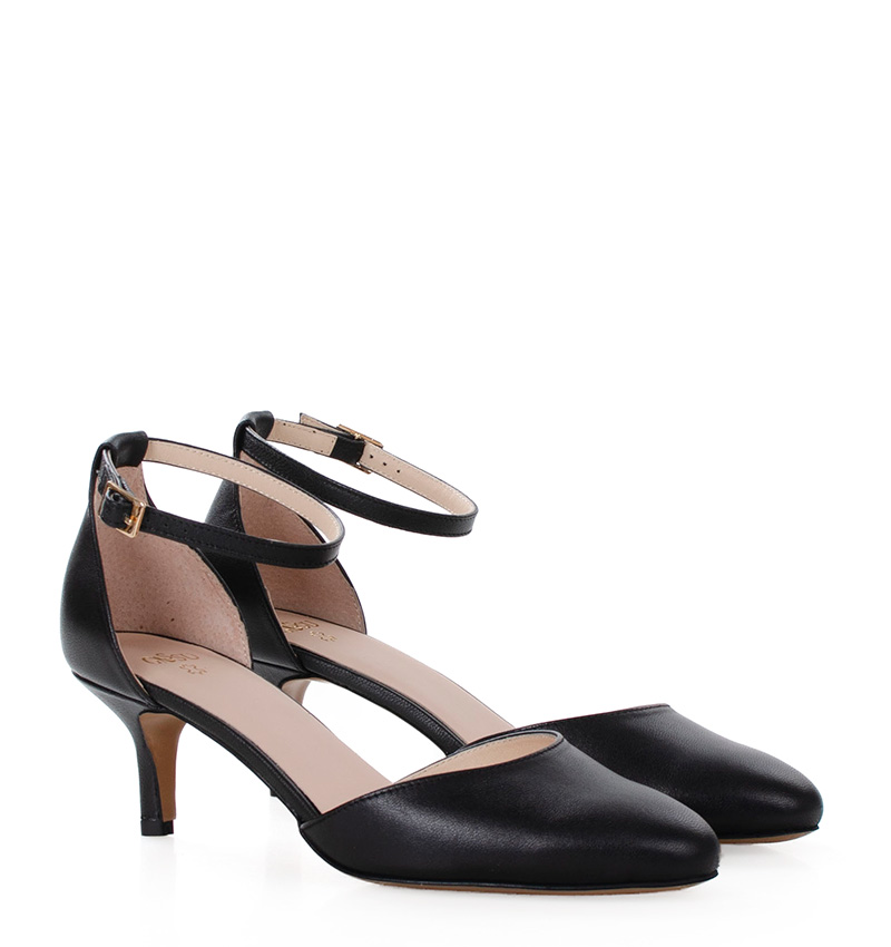 LINDA – Czarne szpilki z paskiem, niski obcas, skóra licowa
