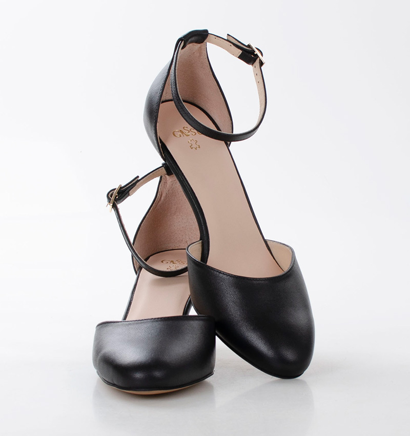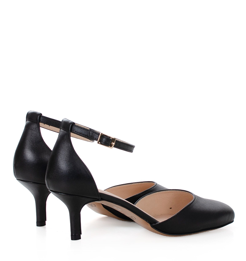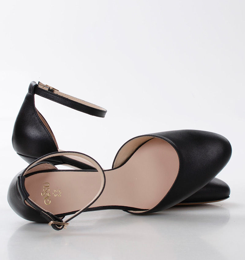 Linda – Czarne szpilki na 5,5 cm obcasie (wysokość obcasa jest mierzona w rozmiarze 37). Nad kostką cienki pasek oplatający nogę, zapinane na klamerkę. Buty wykonane z naturalnej skóry licowej układającej się do stopy. Cholewka odkryta. Tęgość butów: F 1/2. Wnętrze szpilek wykończone delikatną skórą naturalną.