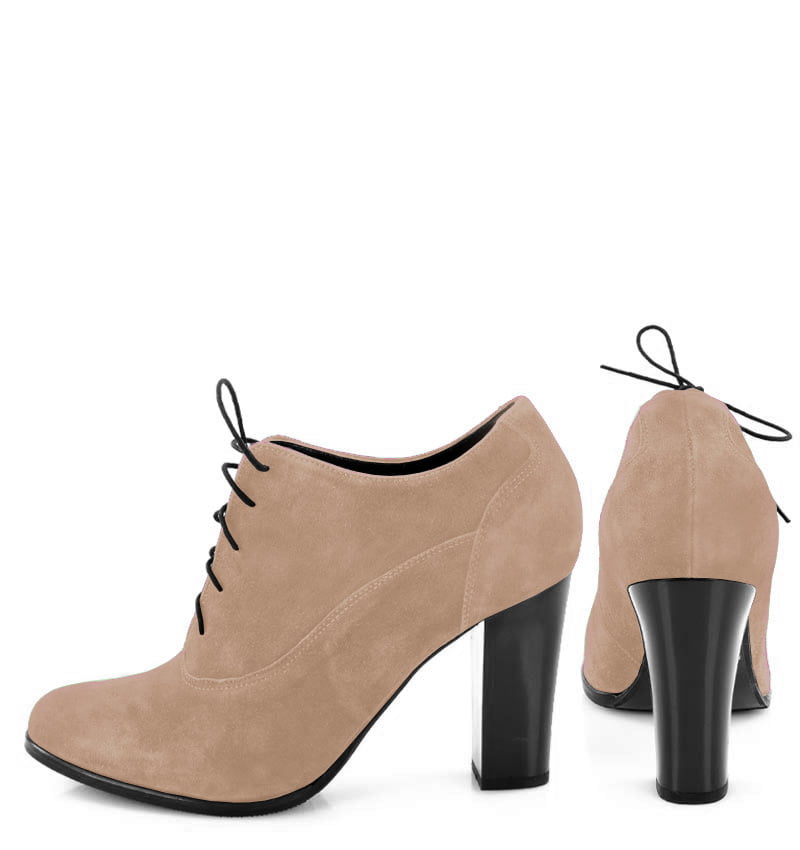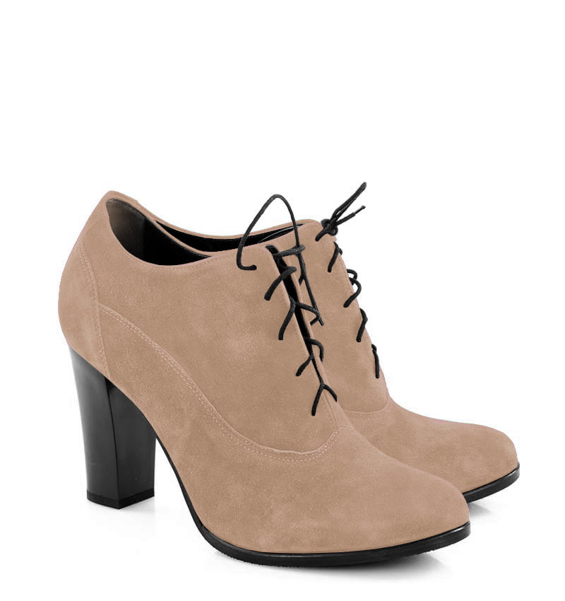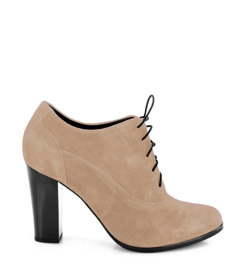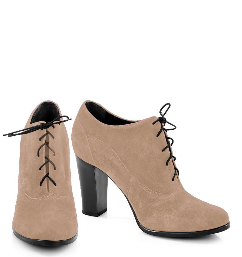 LIZZY – Beżowe botki na 9,5 cm słupku (wysokość obcasa jest mierzona w rozmiarze 37). Czubek migdałowy, cholewka sznurowana. Buty wykonane z naturalnej skóry zamszowej układającej się do stopy. Tęgość butów: F 1/2. Wnętrze butów wykończone skórą naturalną, botki nieocieplone.