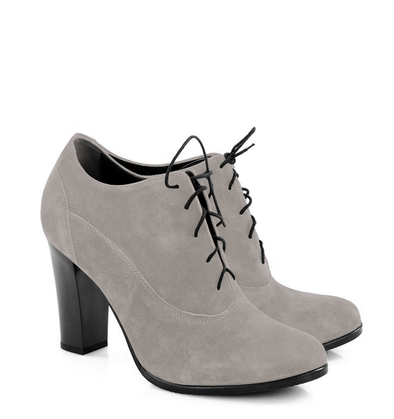 LIZZY – Jasno szare botki na 9,5 cm słupku (wysokość obcasa jest mierzona w rozmiarze 37). Czubek migdałowy, cholewka sznurowana. Buty wykonane z naturalnej skóry zamszowej układającej się do stopy. Tęgość butów: F 1/2. Wnętrze butów wykończone skórą naturalną, botki nieocieplone.