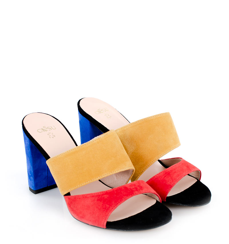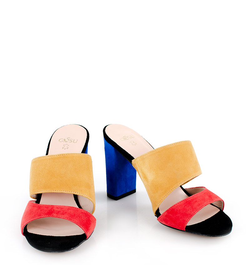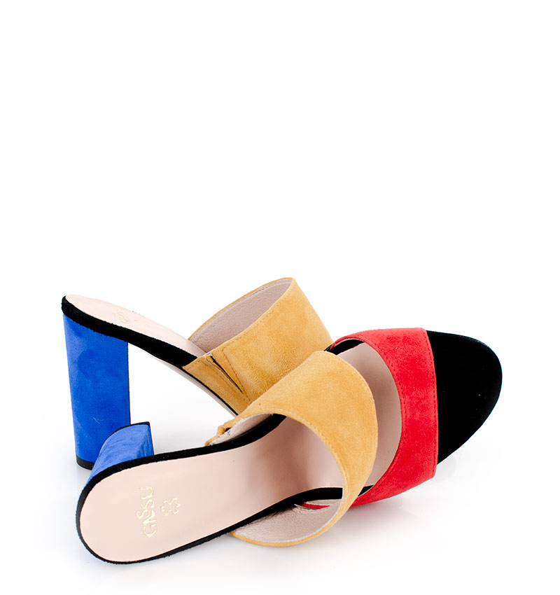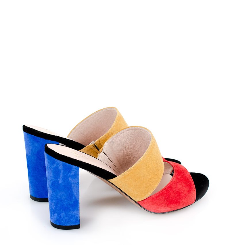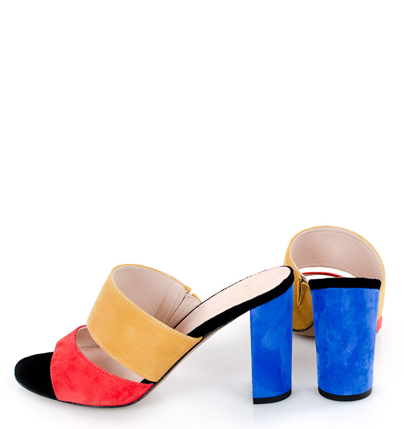 LUNA – Kolorowe klapki na słupku zamszowa skóra