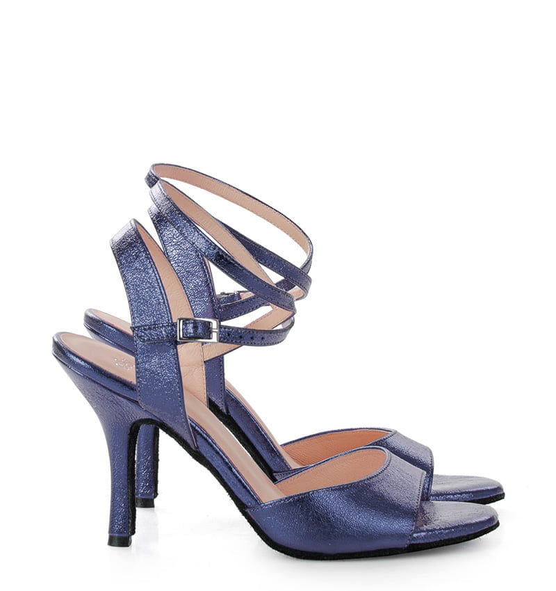 Melissa – Granatowe sandałki z odkrytą piętą, zaprojektowane specjalnie do tańca argentyńskiego tango, salsy, bachaty i kizomby. Wyposażone w dodatkową, miękką poduszkę pod palcami, zapewniają komfort podczas tańca. Welurowa podeszwa nadaje im miękkość, umożliwiając swobodny ruch stopy na parkiecie. Buty te są przeznaczone wyłącznie do użytku wewnętrznego.