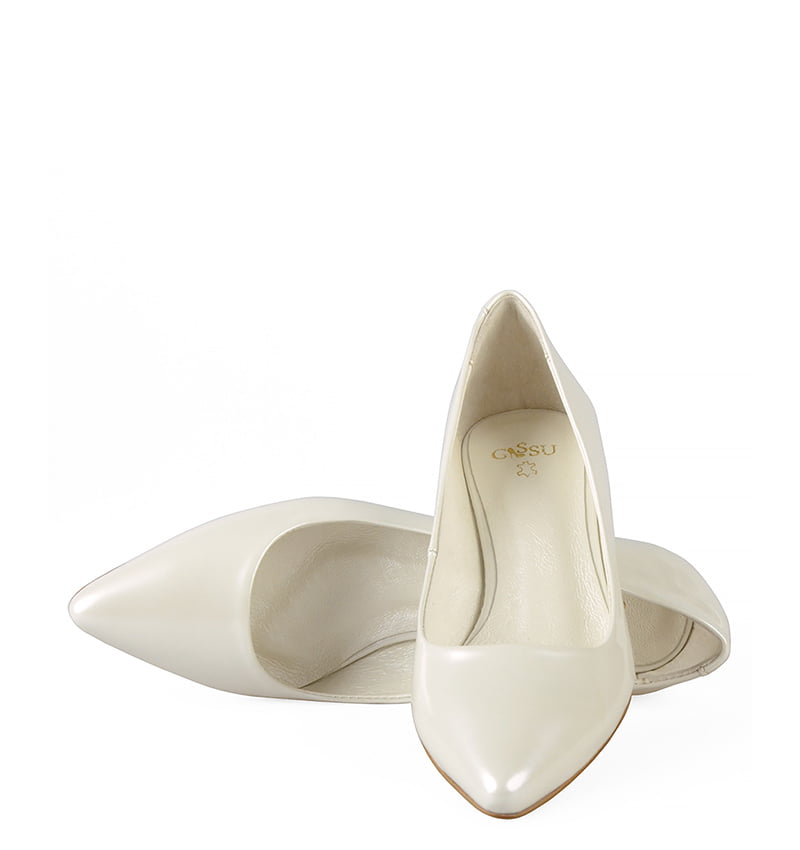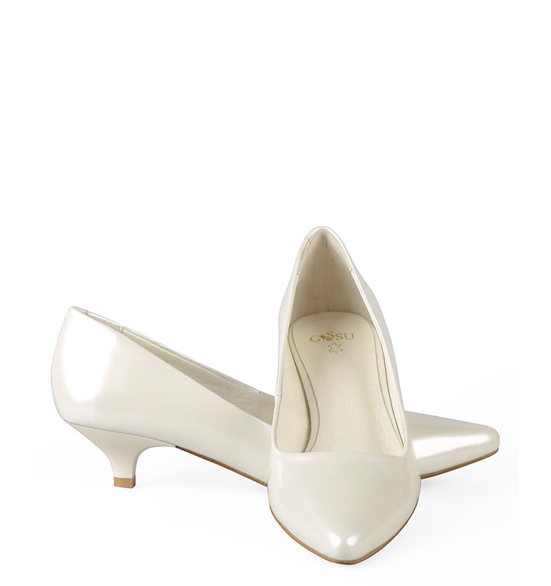 MICHELLE – Ecru szpilka z perłowej lakierowanej skóry na niskim obcasie
