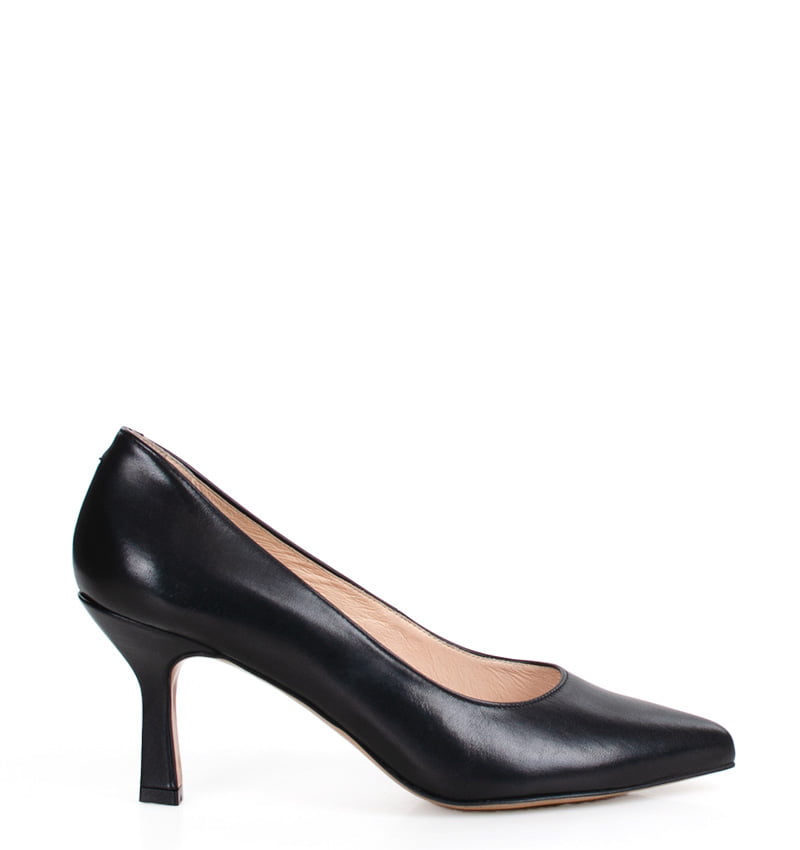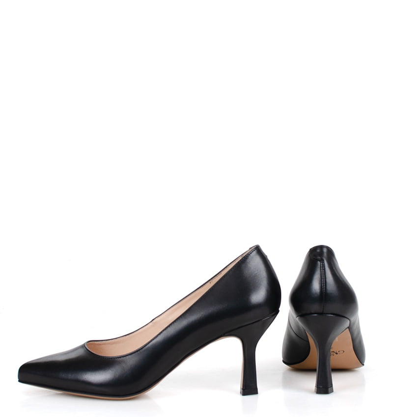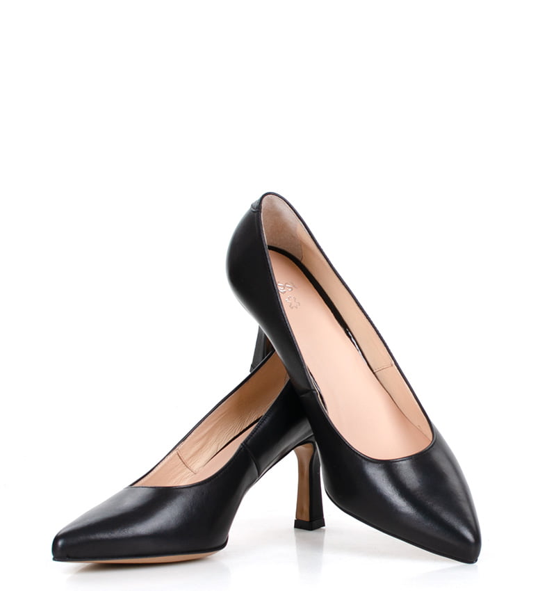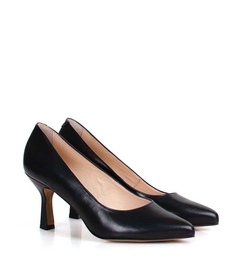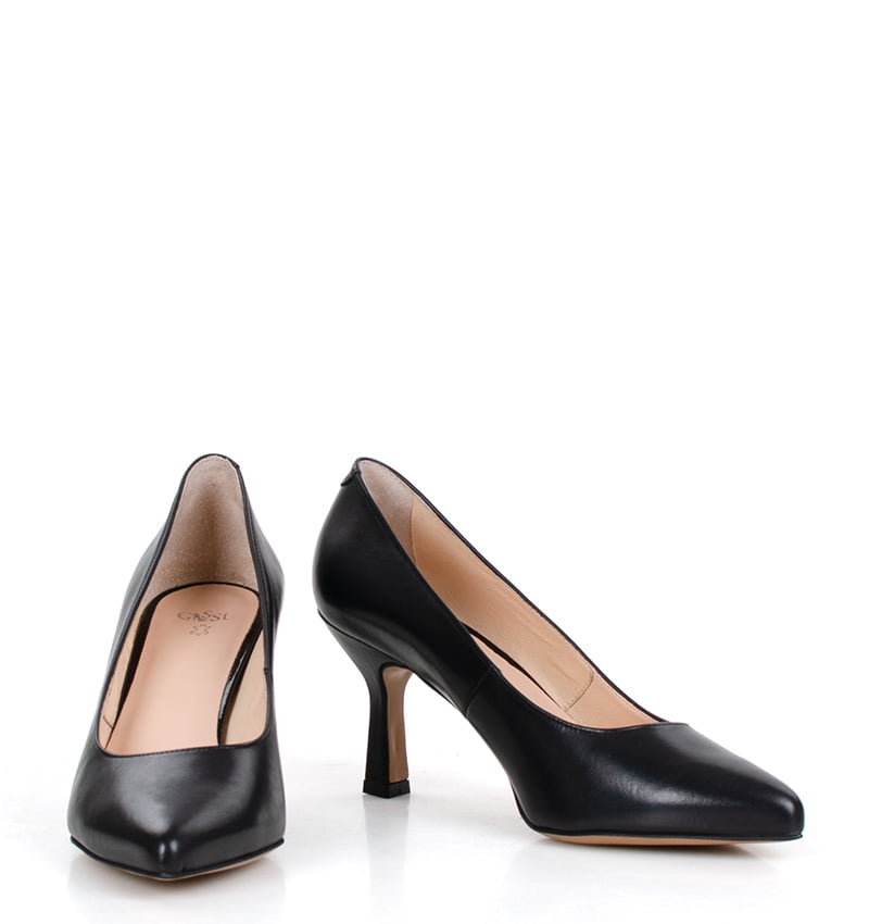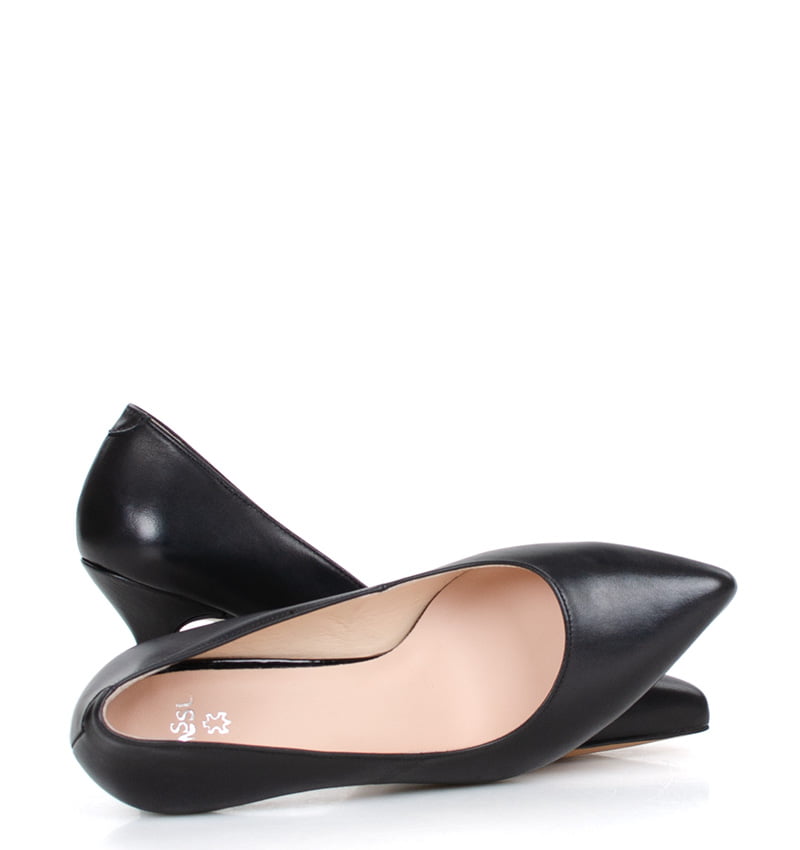 NADINE – Czarne szpilki na 8 cm obcasie (wysokość obcasa jest mierzona w rozmiarze 37). Delikatnie rozszerzający się ku dołowi obcas (typu kieliszek) oraz nosek w szpic optycznie wyszczuplają but. Wykonane z naturalnej skóry licowej. Średnia wysokość obcasa sprawia, że są to bardzo wygodne szpilki. Tęgość butów: F 1/2. Wnętrze butów i wkładka wykonane są ze skóry naturalnej.