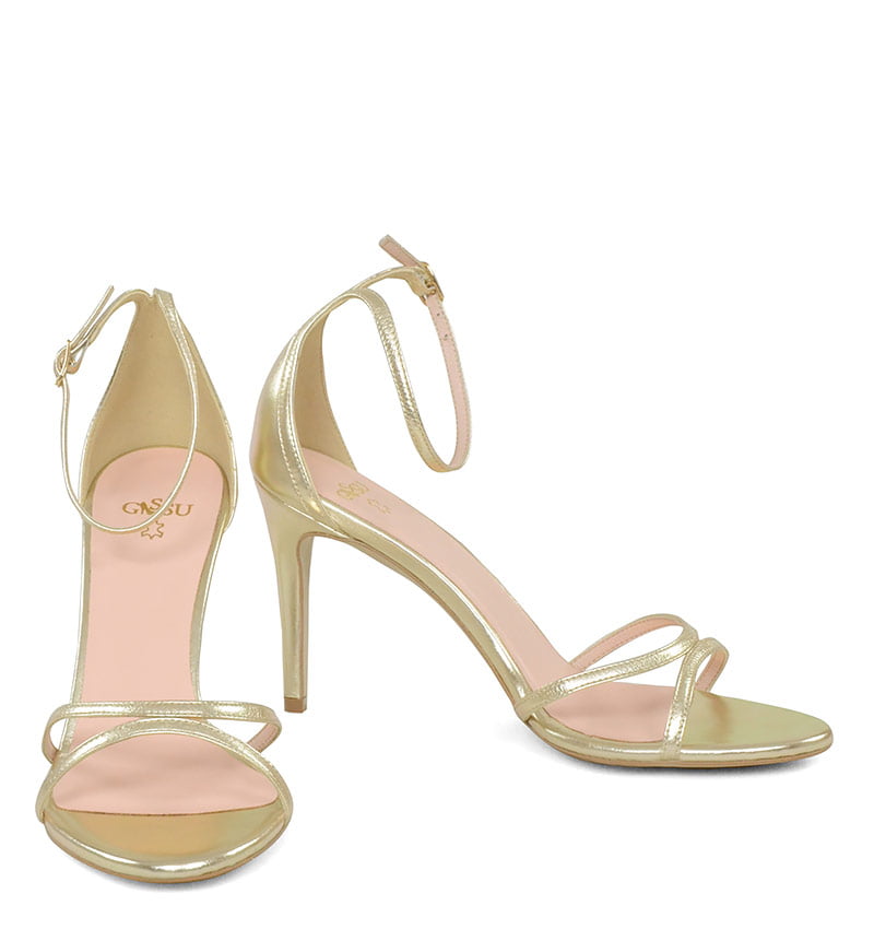 NARE – Złote sandałki na szpilce, wykonane z naturalnej skóry licowej. Obcas 9 cm (wysokość obcasa jest mierzona dla rozmiaru 37). Cholewka w postaci cienkich paseczków i mocniej wykrojona pięta, dodaje sandałkom delikatności. Tęgość butów to F 1/2. Wnętrze wykończone delikatną skórą naturalną. Złote sandałki są elementem kolekcji butów bo ślubu.