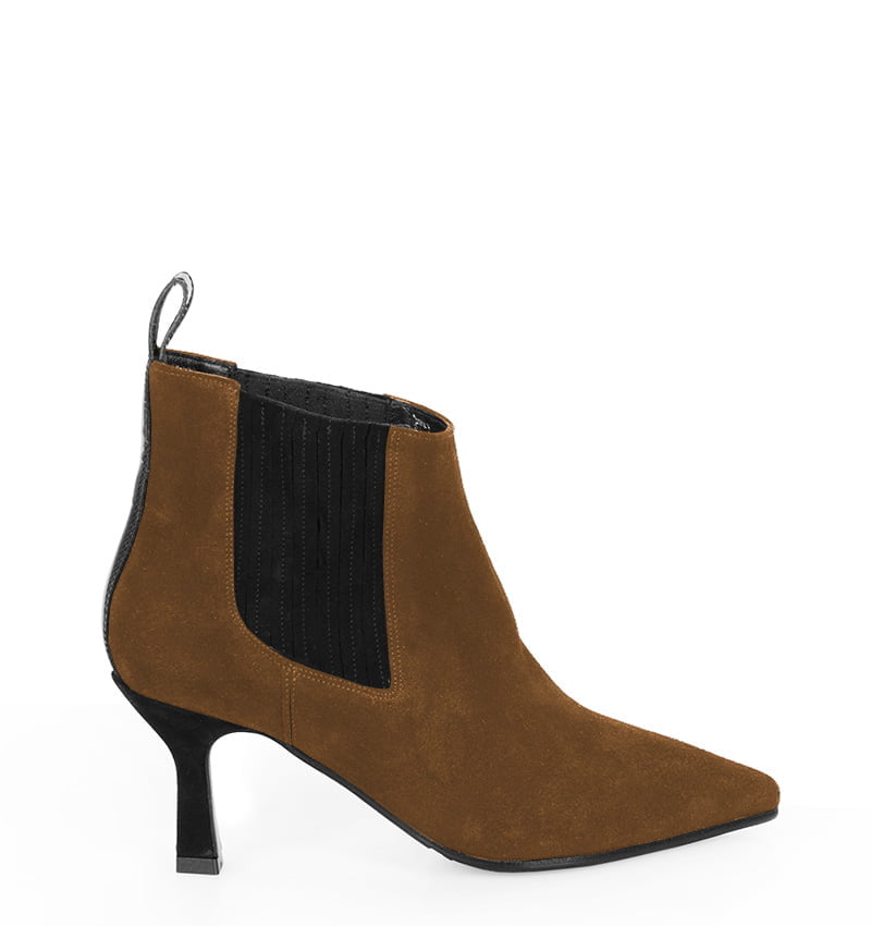 NOA – Brązowe krótkie botki na 8 cm obcasie (wysokość obcasa jest mierzona w rozmiarze 37). Czubek w szpic, cholewka wsuwana dzięki zastosowanym po bokach szerokim gumką. Buty wykonane z naturalnej skóry welurowej układającej się do stopy. Tęgość butów: F 1/2. Wnętrze butów wykończone skórą naturalną. Botki nieocieplone.