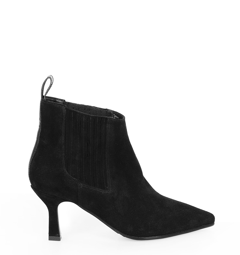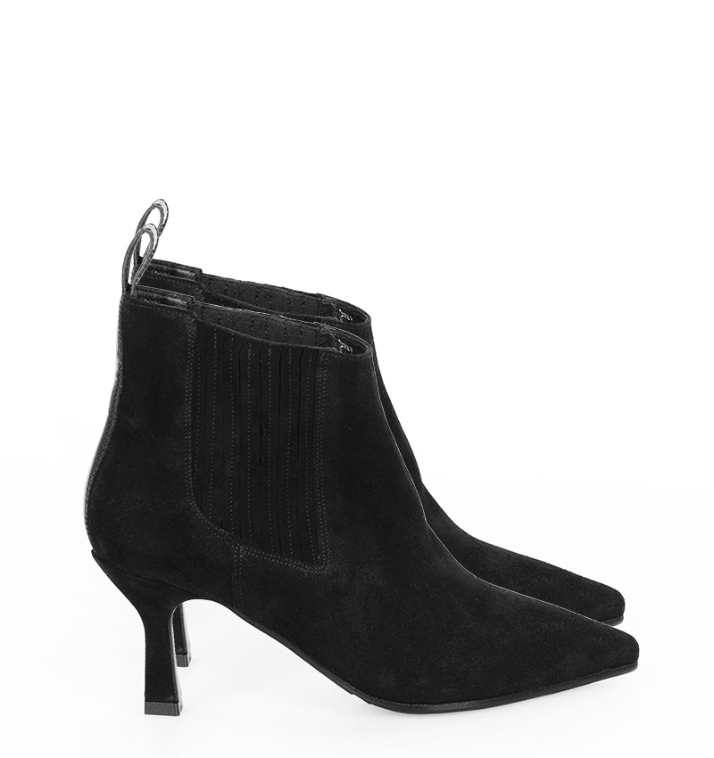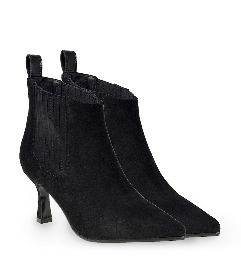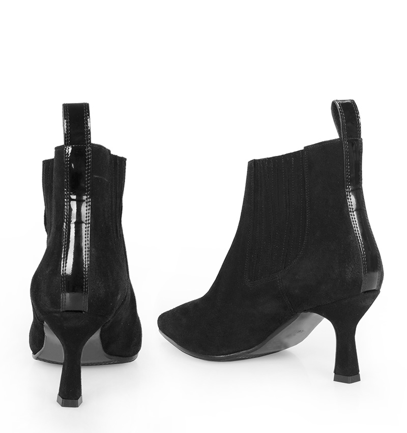 NOA –  Czarne krótkie botki na 8 cm obcasie (wysokość obcasa jest mierzona w rozmiarze 37). Czubek w szpic, cholewka wsuwana dzięki zastosowanym po bokach szerokim gumką. Buty wykonane z naturalnej skóry nubukowej układającej się do stopy. Tęgość butów: F 1/2. Wnętrze butów wykończone skórą naturalną. Botki nieocieplone.