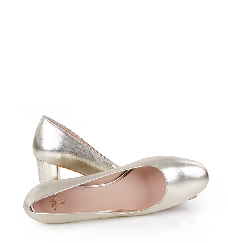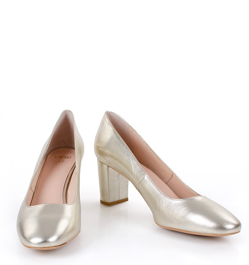NORMA –  Złote czółenka na grubym słupku o wysokości 7,5 cm (wysokość obcasa jest mierzona w rozmiarze 37). Czubek  okrągły. Buty wykonane z naturalnej skóry licowej. Wysokość i szerokość obcasa sprawia, że są to bardzo wygodne czółenka. Tęgość butów: F 1/2. Wnętrze butów i wkładka wykonane są ze skóry naturalnej.