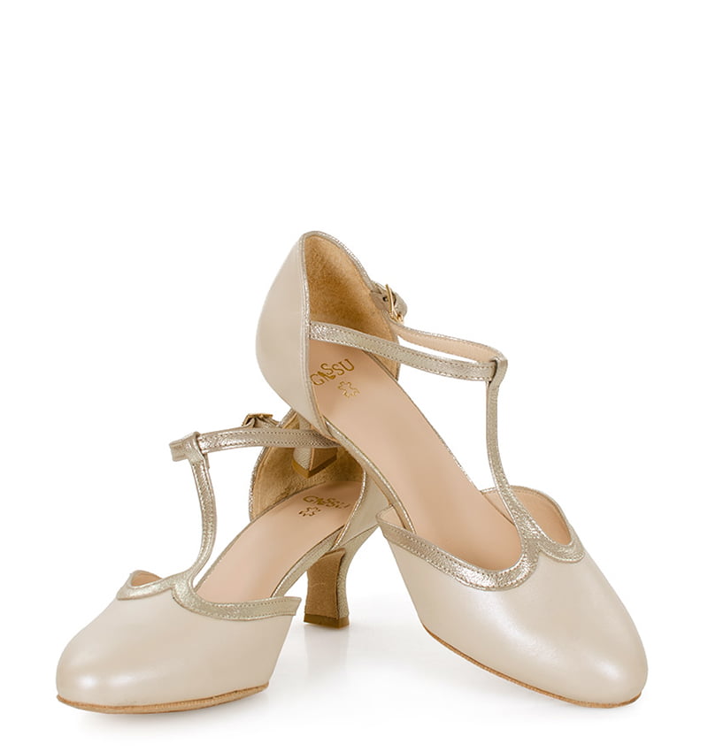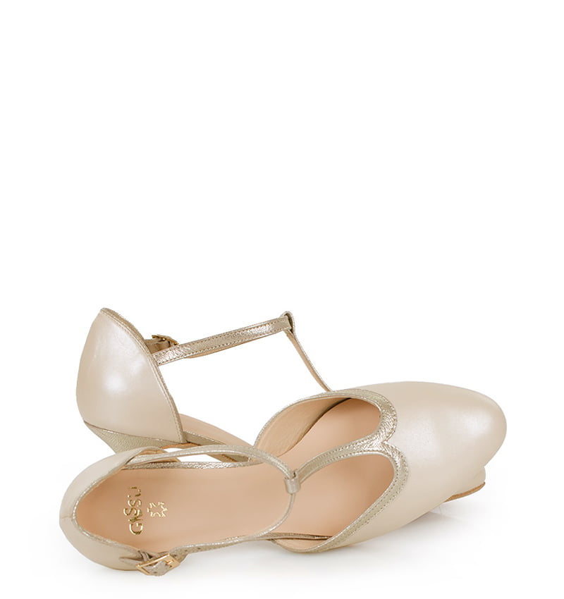 OLIVIA – Czółenka jasnobeżowe z perłowym połyskiem, wykończone złotą lamówką i paskiem t-strap. Obcas o wysokości 5,5 cm (wysokość obcasa jest mierzona dla rozmiaru 37). Buty dedykowane do tanga i tańca towarzyskiego, choć chętnie kupowane również przez panny młode jako idealne buty do ślubu. Podeszwa skórzana ze skóry welurowej (łosiówka), dzięki czemu jest miękka i elastyczna. Olivia to wygodne buty do tańca oraz ze względu na średni obcas są to również dobre buty do ćwiczeń. Cholewka wykonana ze skóry naturalnej. Czółenka zapinane na sprzączkę.