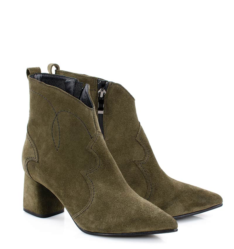 PEGGY – Ciemno zielone botki na stabilnym 6,5 cm słupku (wysokość obcasa jest mierzona w rozmiarze 37). Cholewka za kostkę wykonana z welurowej skóry naturalnej, ozdobiona motywem klasycznych kowbojek. Nosek w szpic wysmukla sylwetkę buta. Zapinane na zamek, dzięki czemu są wygodne w zakładaniu. Botki nie ocieplone, dzięki czemu będą idealne na ciepłe jesienno-zimowe dni. Czubek w migdałowy. Tęgość butów: F 1/2. Wnętrze butów i wkładka wykonane są ze skóry naturalnej.